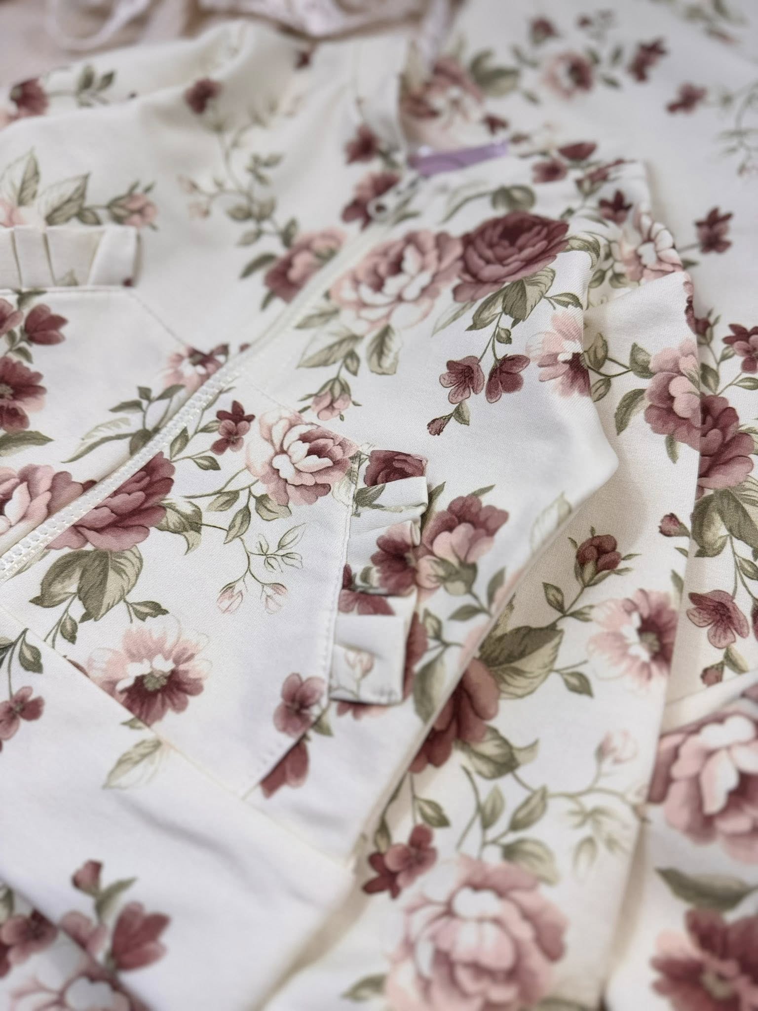 Śliczna bluza bomberka dla dziewczynki w delikatne kwiaty na śmietance z nutą pistacji. Idealnie sprawdzi się na sesje świąteczne i wyjątkowe okazje.