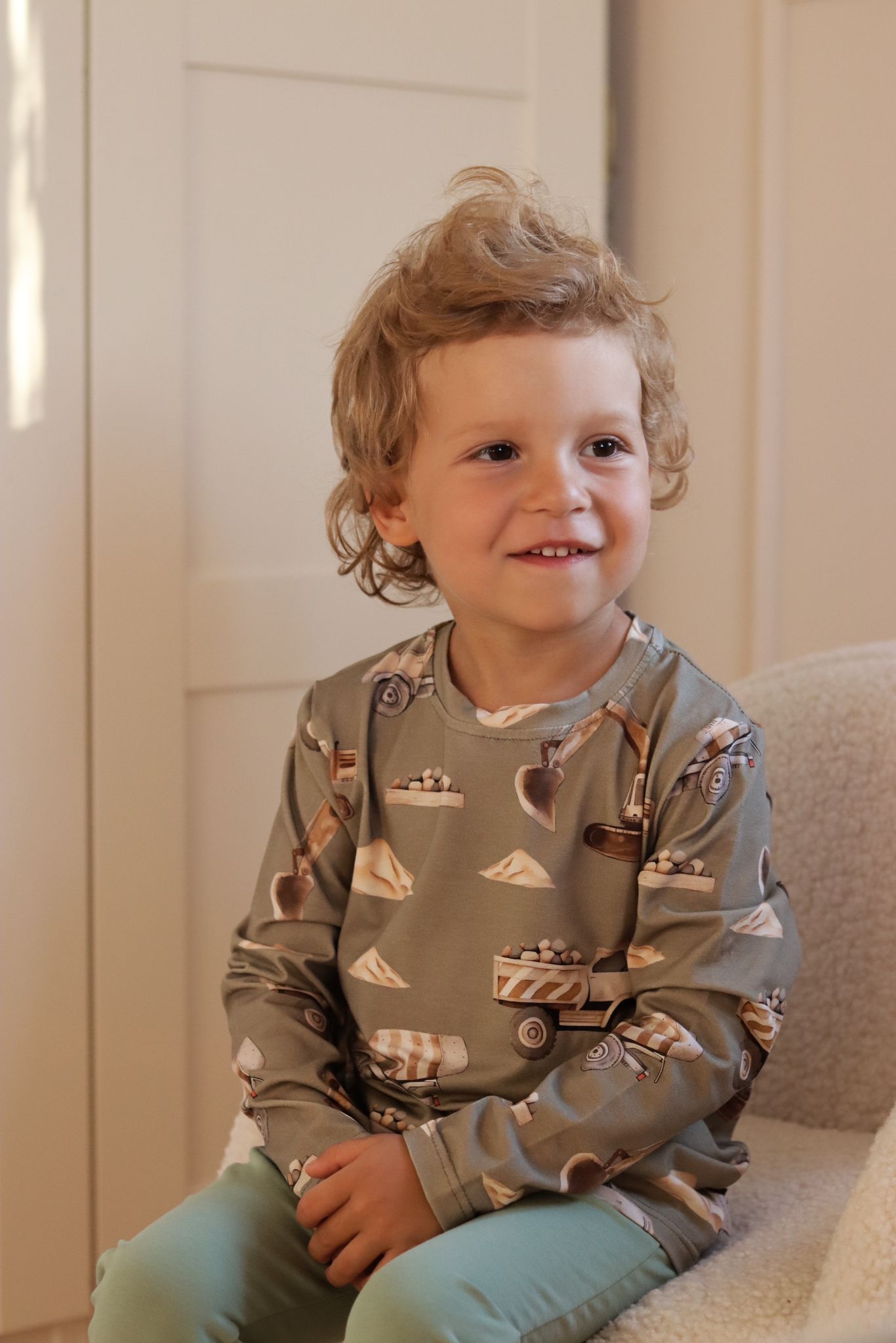 Bluzka chłopięca z długim rękawkiem. Na jasnym tle koparki i inne maszyny budowlane.