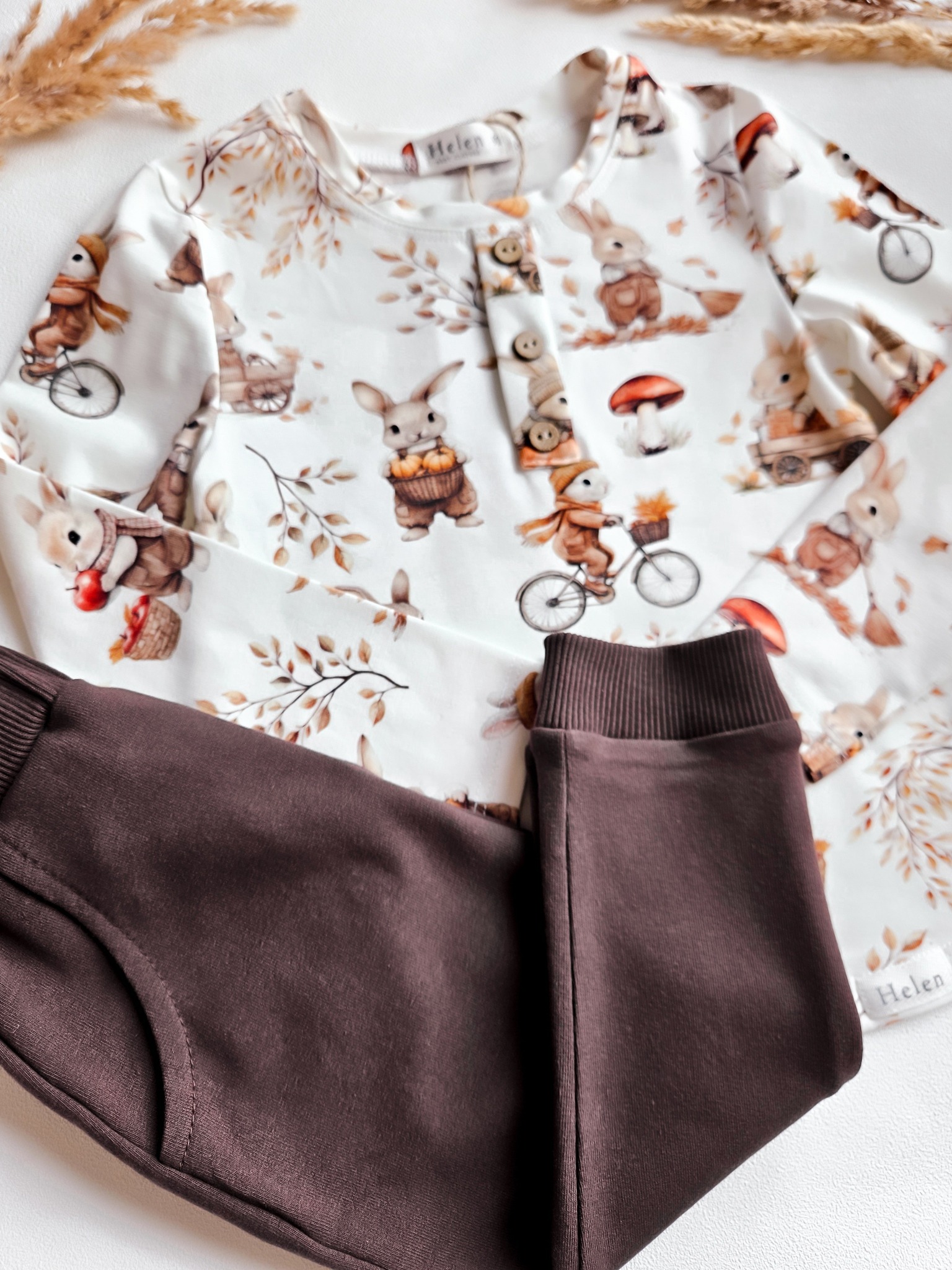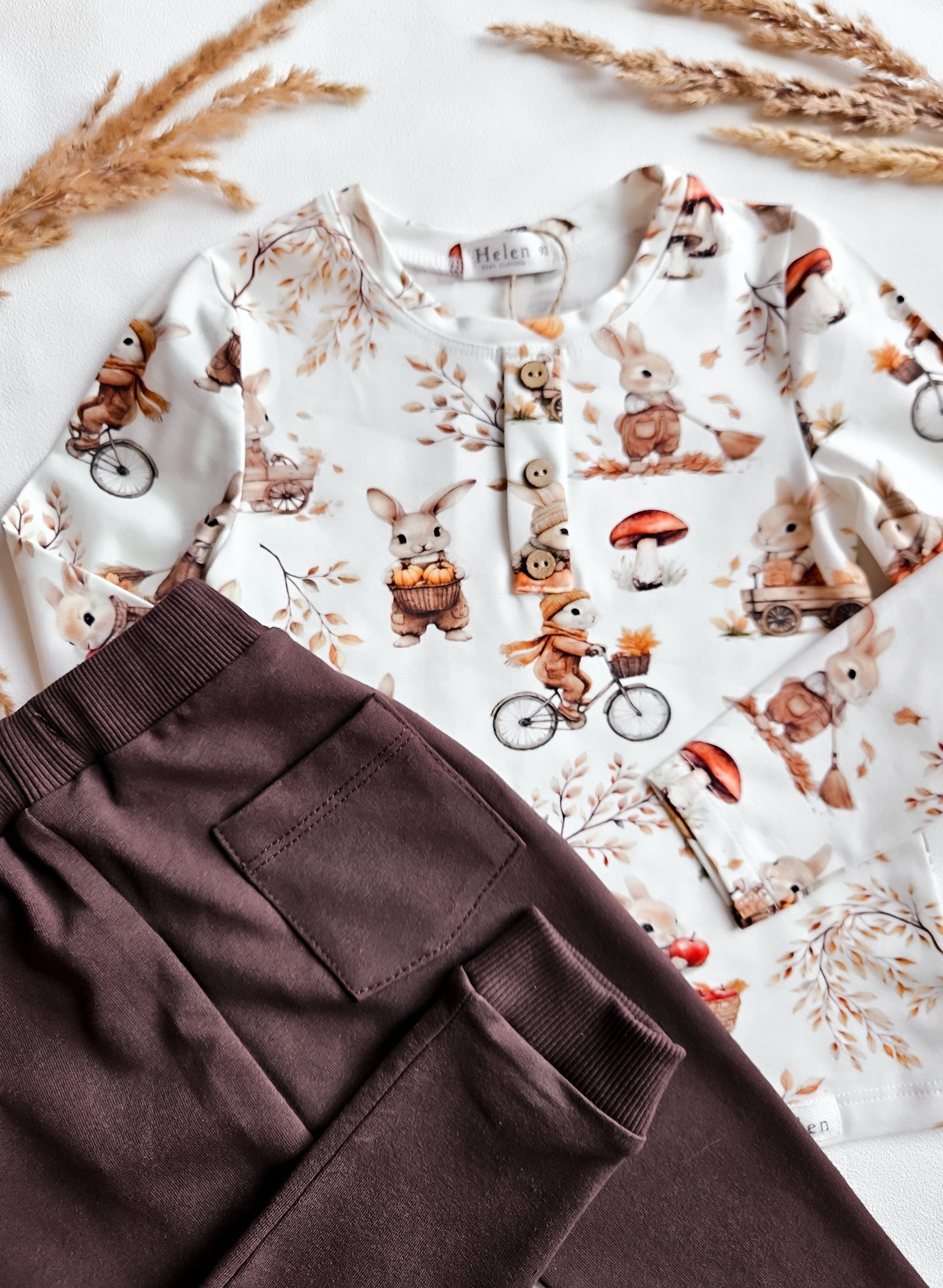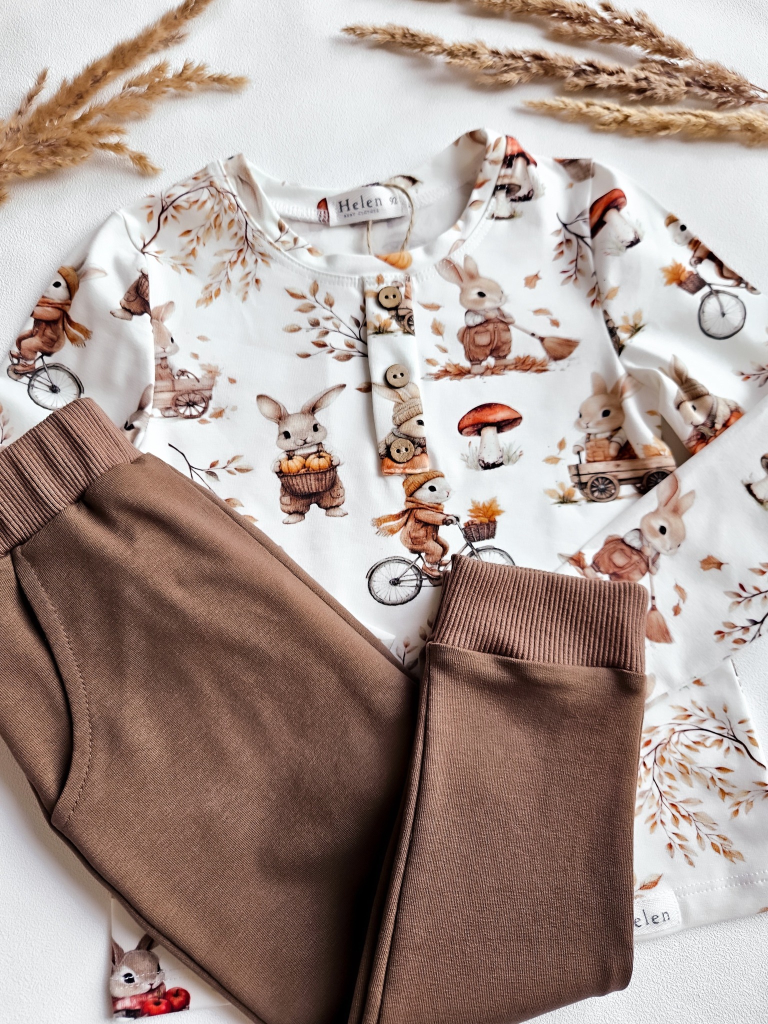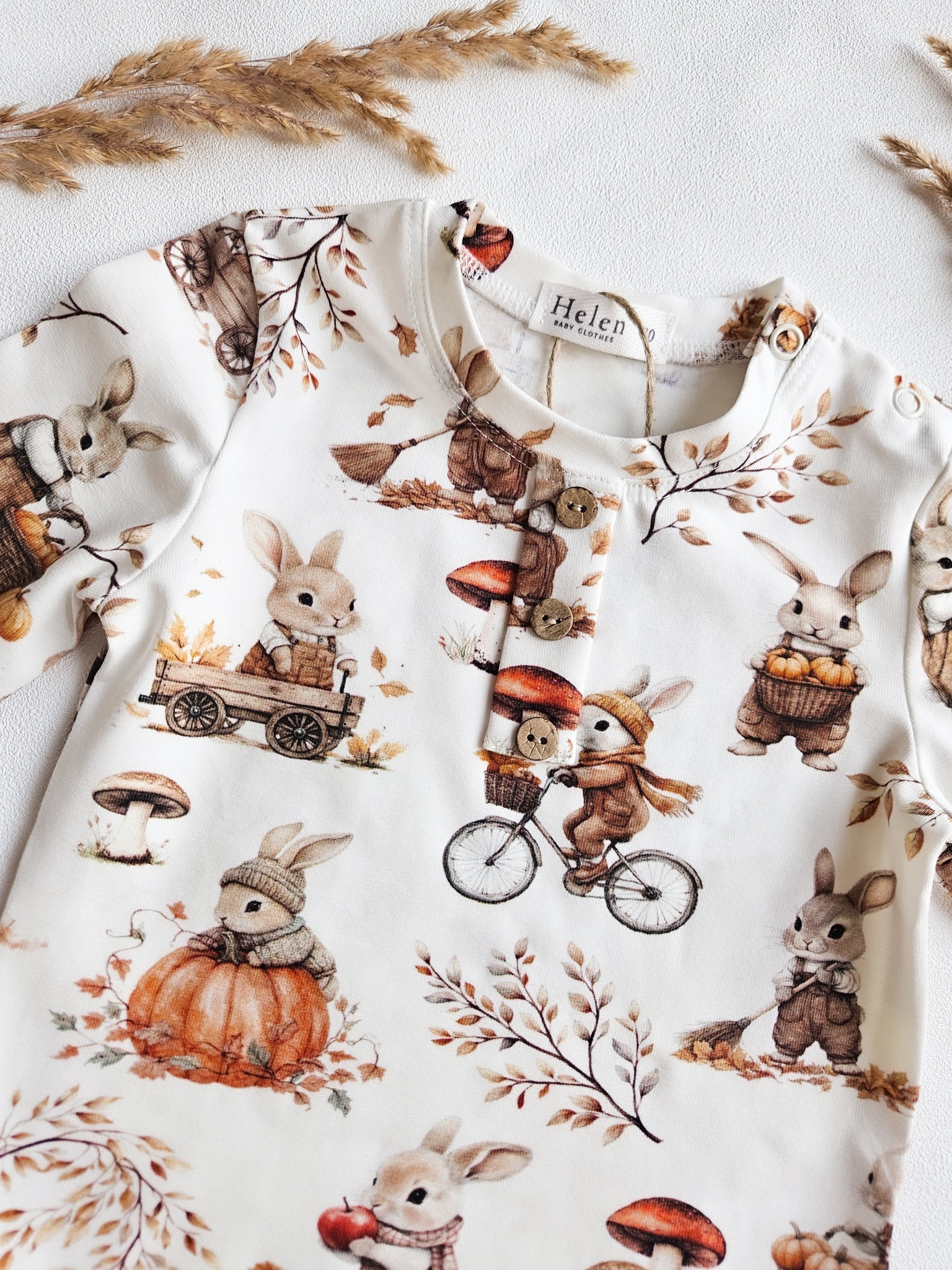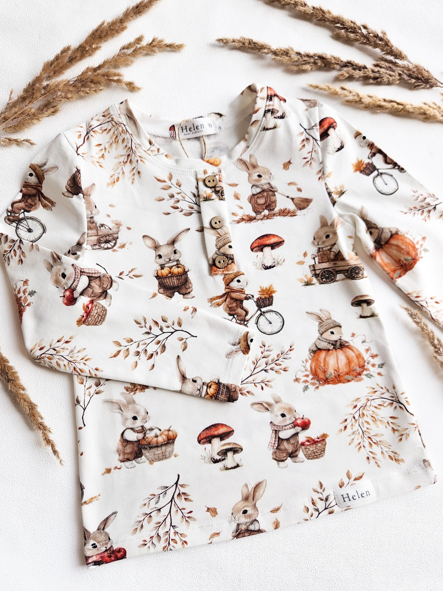 Oryginalne bluzeczki dla chłopaków z długim rękawkiem w jesienny wzór z króliczkami i dyniami.