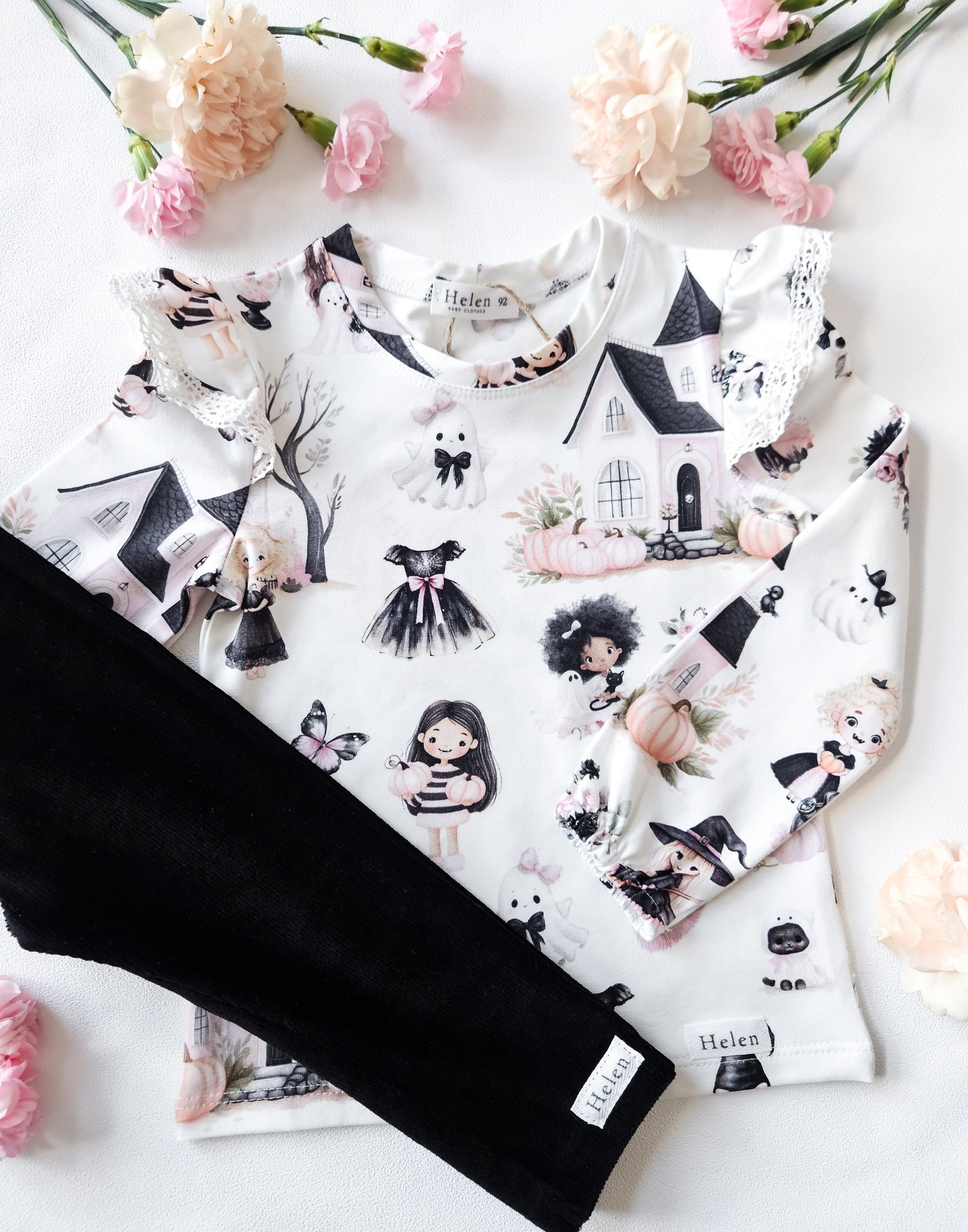 Prześliczne bluzeczki dla dziewczynki z bawełny we wzór na HALLOWEEN .  Rękawki ozdobione koronką.