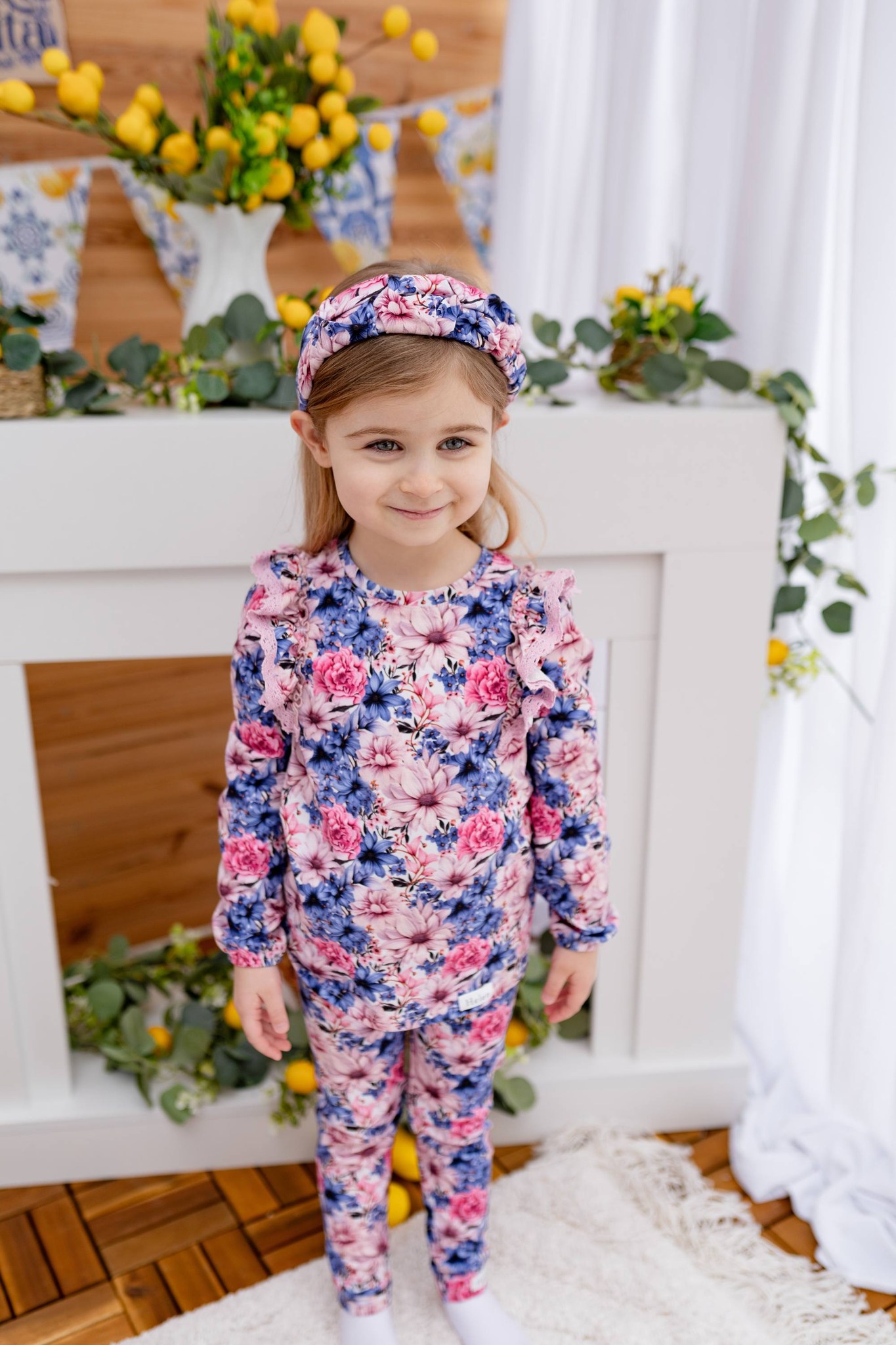 Prześliczne bluzeczki dla dziewczynki z bawełny w wiosenny wzór niebieski ogród.  Bluzeczka ozdobiona koronką.
