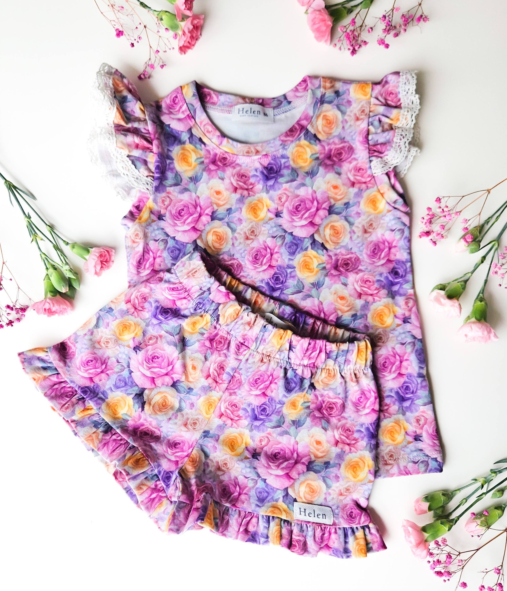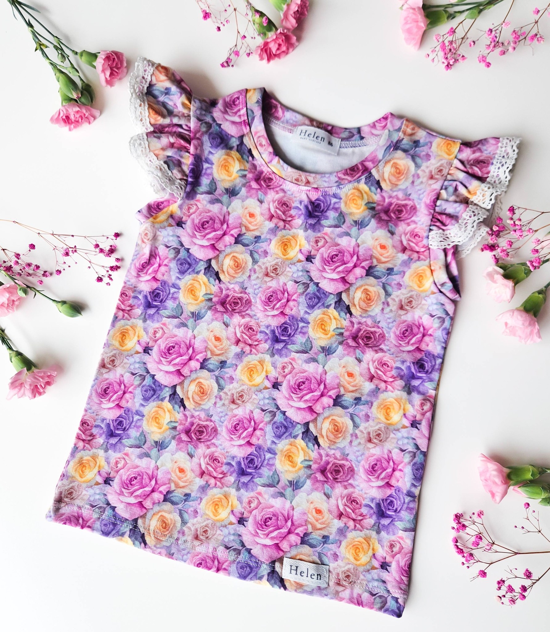Bluzka dla dziewczynki w kolorowe różyczki. Rękawek typu motylek z koronką.
