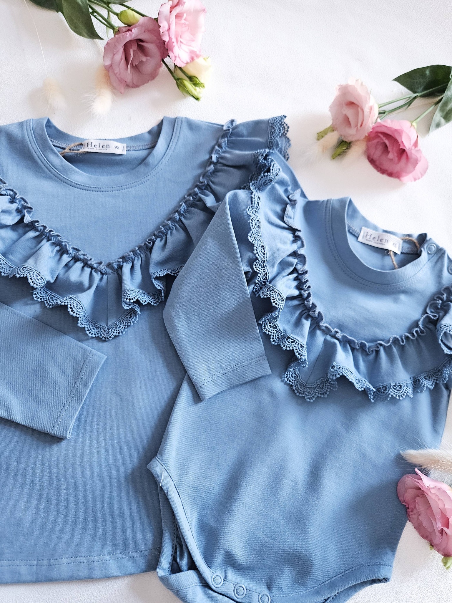 Niebieskie bluzki dla dziewczynki z ozdobną koronką V z długim rękawkiem. Idealnie będą pasowały do wyjątkowych stylizacji.