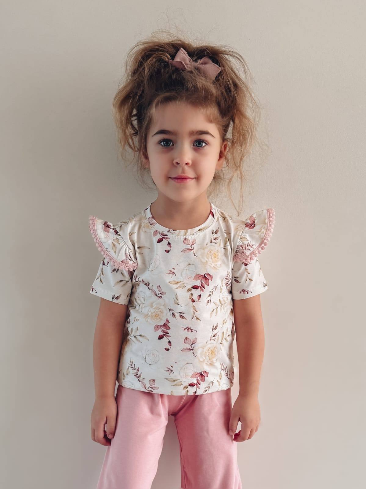Bluzka z krótkim rękawkiem , ozdobnym motylkiem z delikatną koronką.
