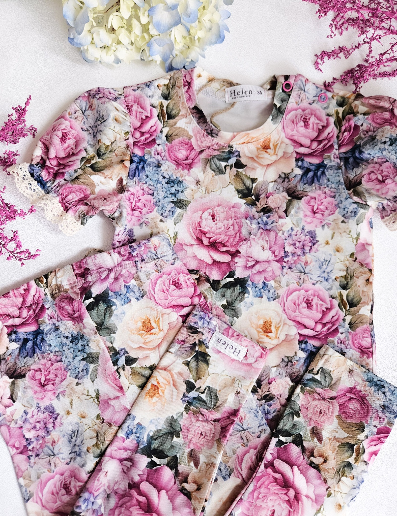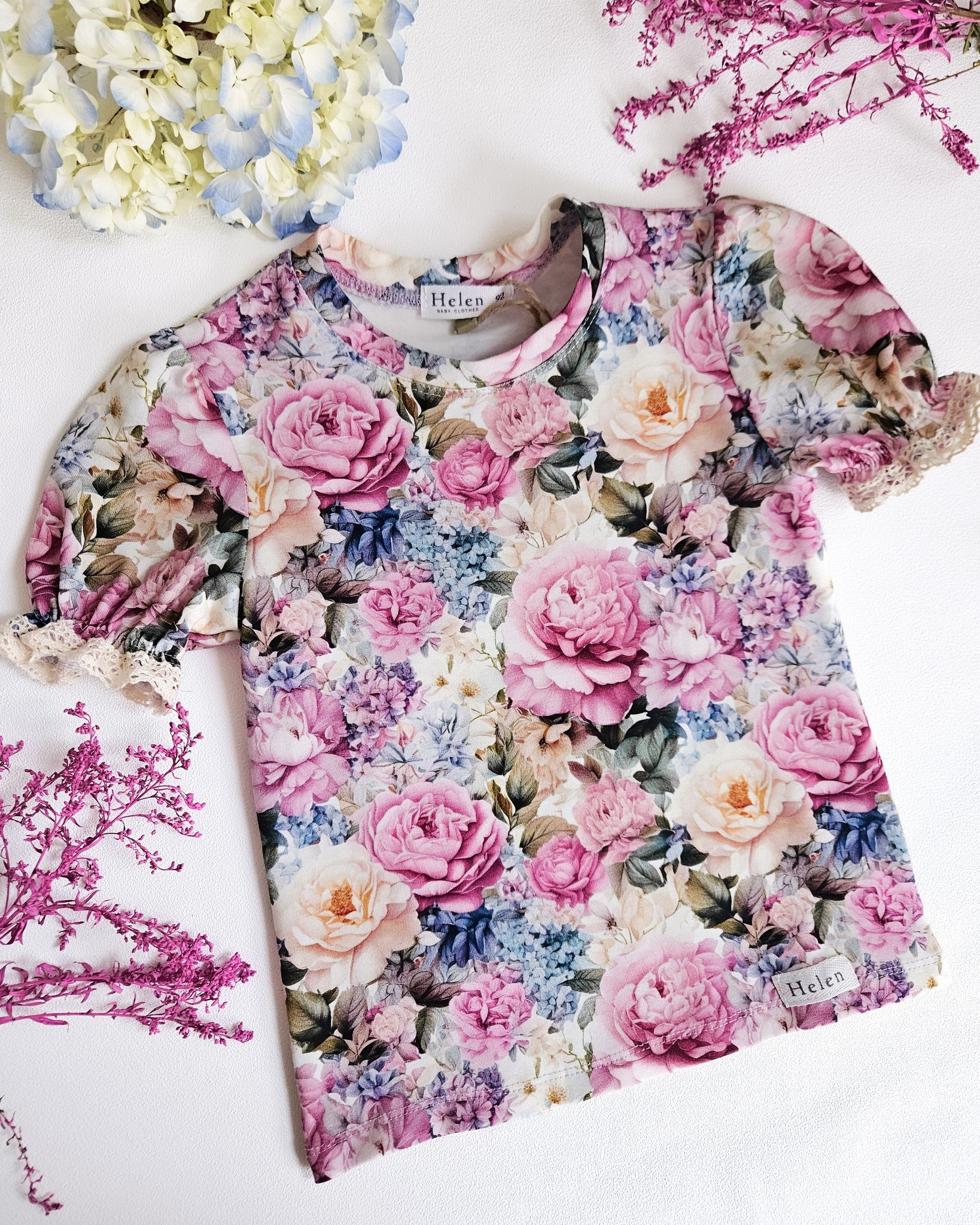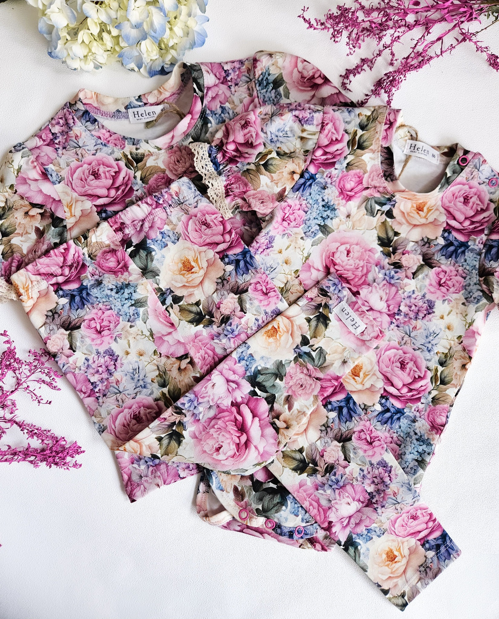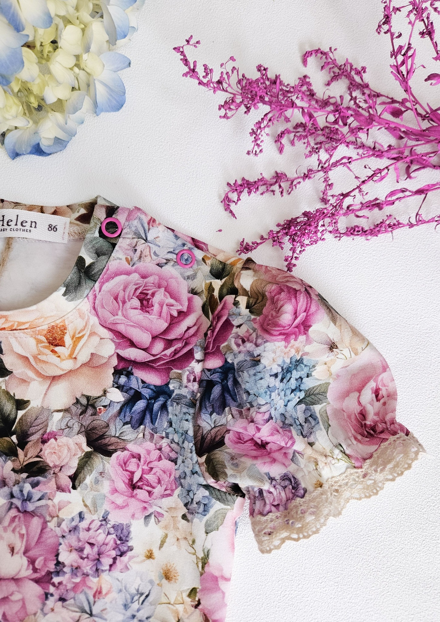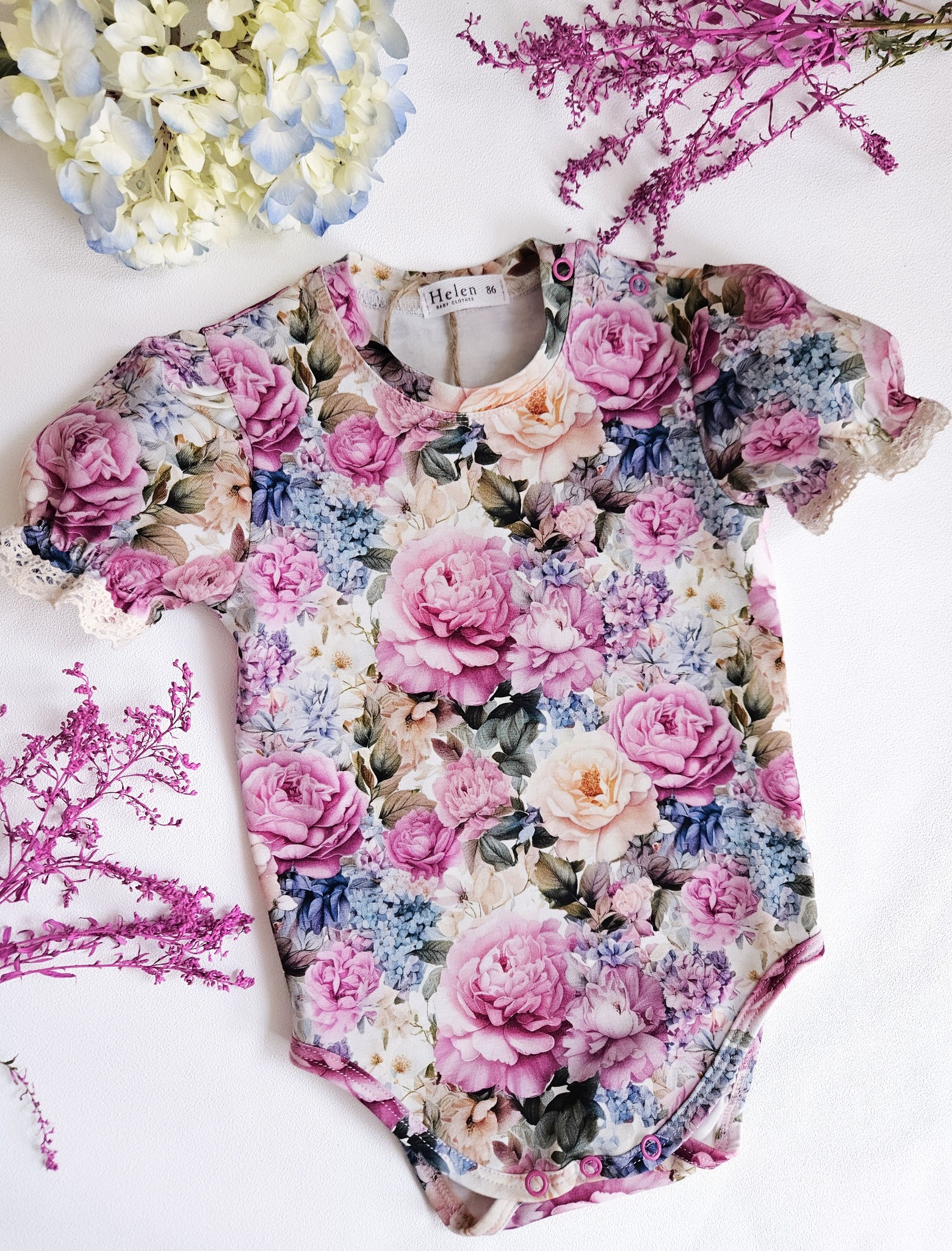 Prześliczne body i bluzeczki z bawełny w wiosenny wzór tęczowy ogród.  Bluzeczka z krótkim rękawkiem i ozdobną koronką. Idealna stylizacja na wiosnę/lato.