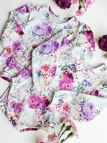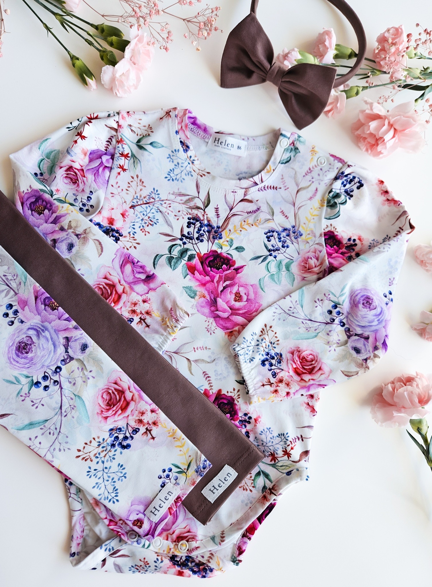 Prześliczne body i bluzeczki dla dziewczynki z bawełny w piękny wzór w kolorowe kwiaty i motyle. Rękawki ozdobione koronką. Idealna stylizacja na jesień.