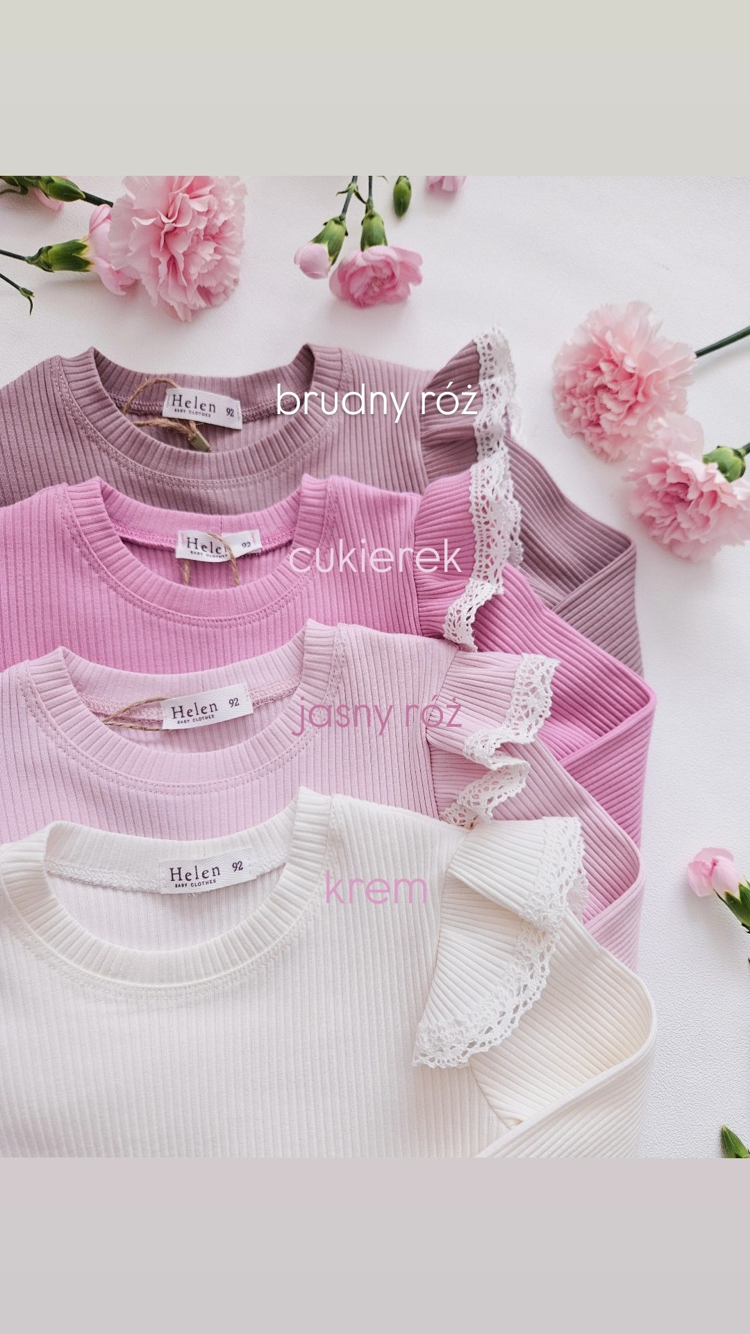 Dostępne w 4 kolorach: ecru, jasny róż, cukierek i brudny róż.
