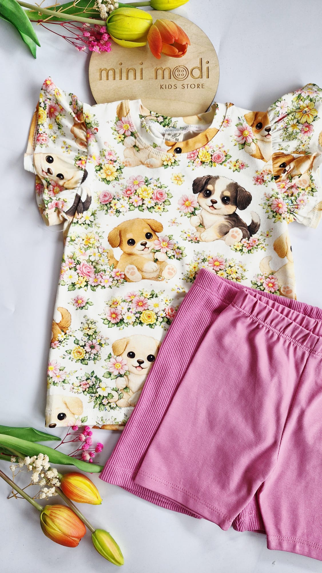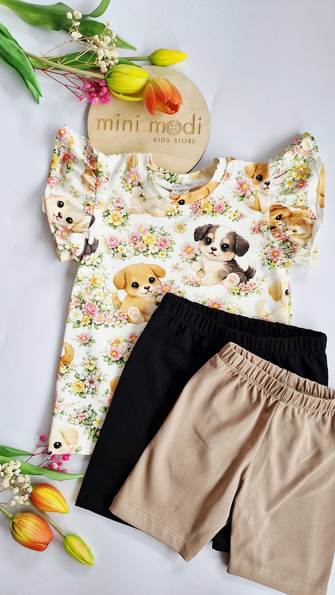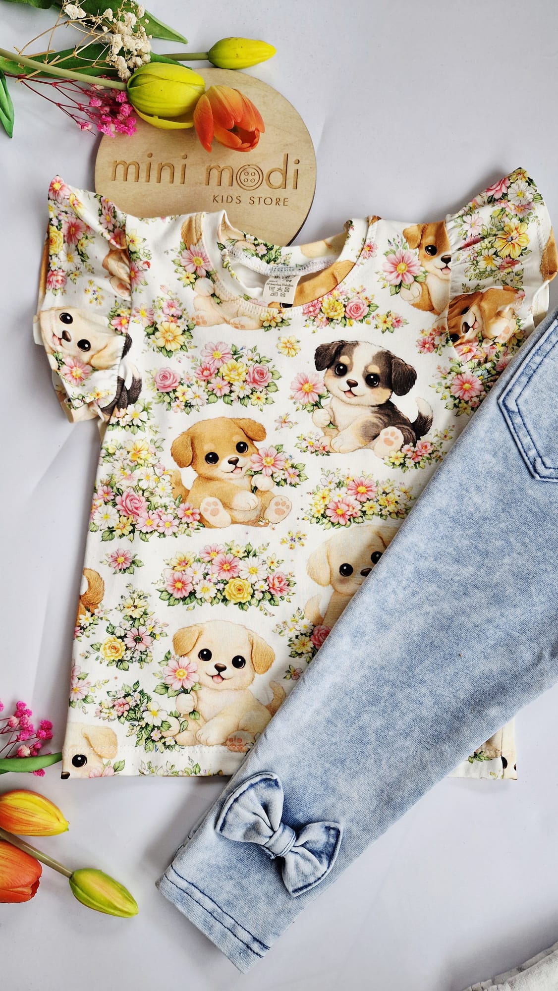 Bawełniane bluzeczki z krótkim rękawkiem i ozdobną falbanką. Wiosenno – leni wzór w pieski w kwiatach. Dostępne w rozmiarach 86 – 134.