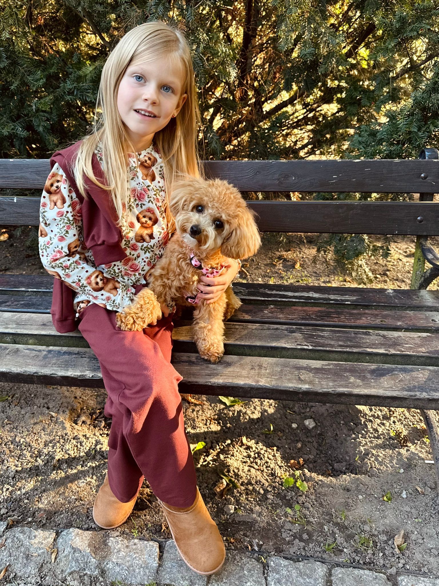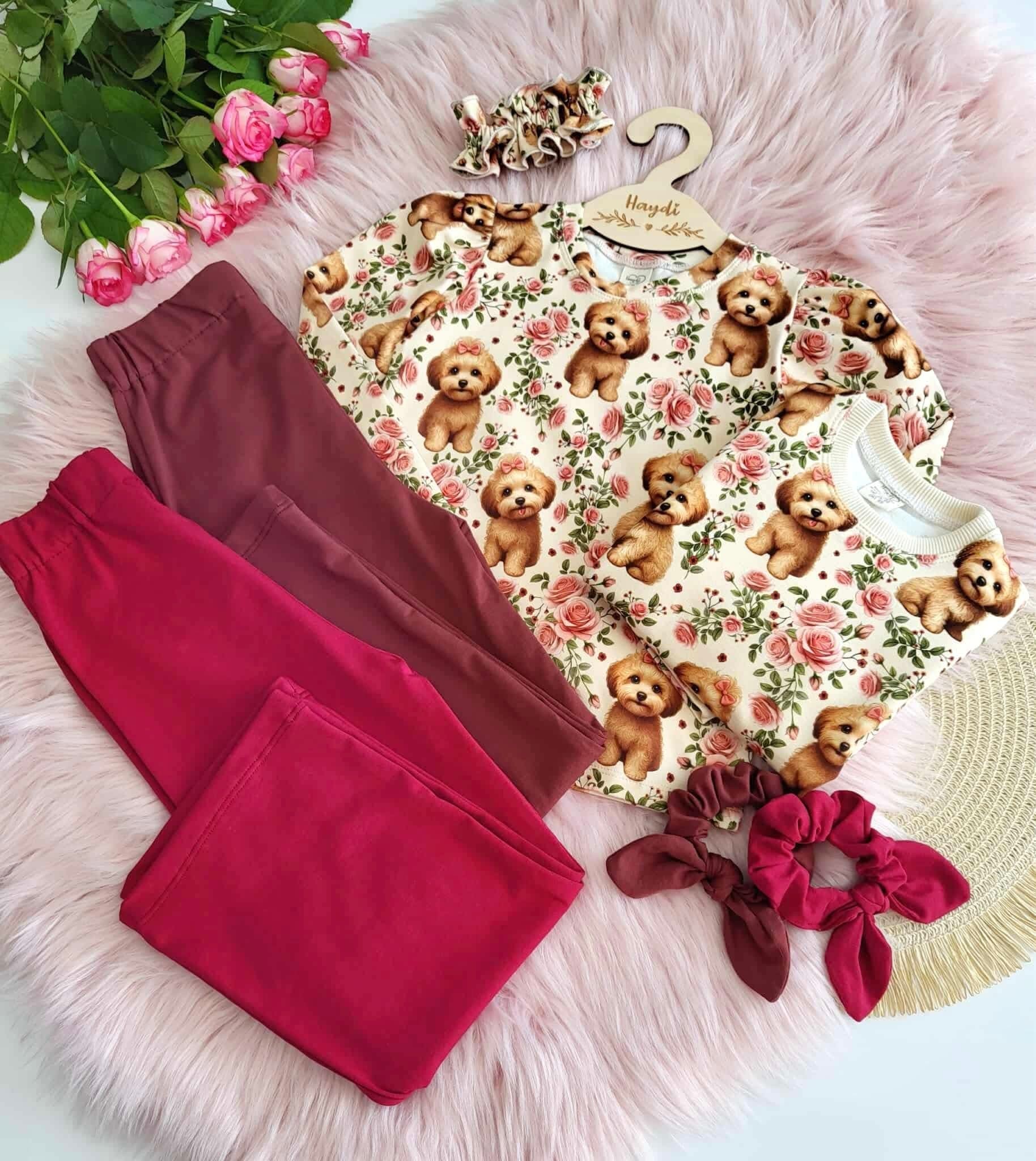 Klasyczne body / bluzeczki dla dziewczynki w jesienny print. Wzór w słodkie pieski i kwiaty na beżowym tle.