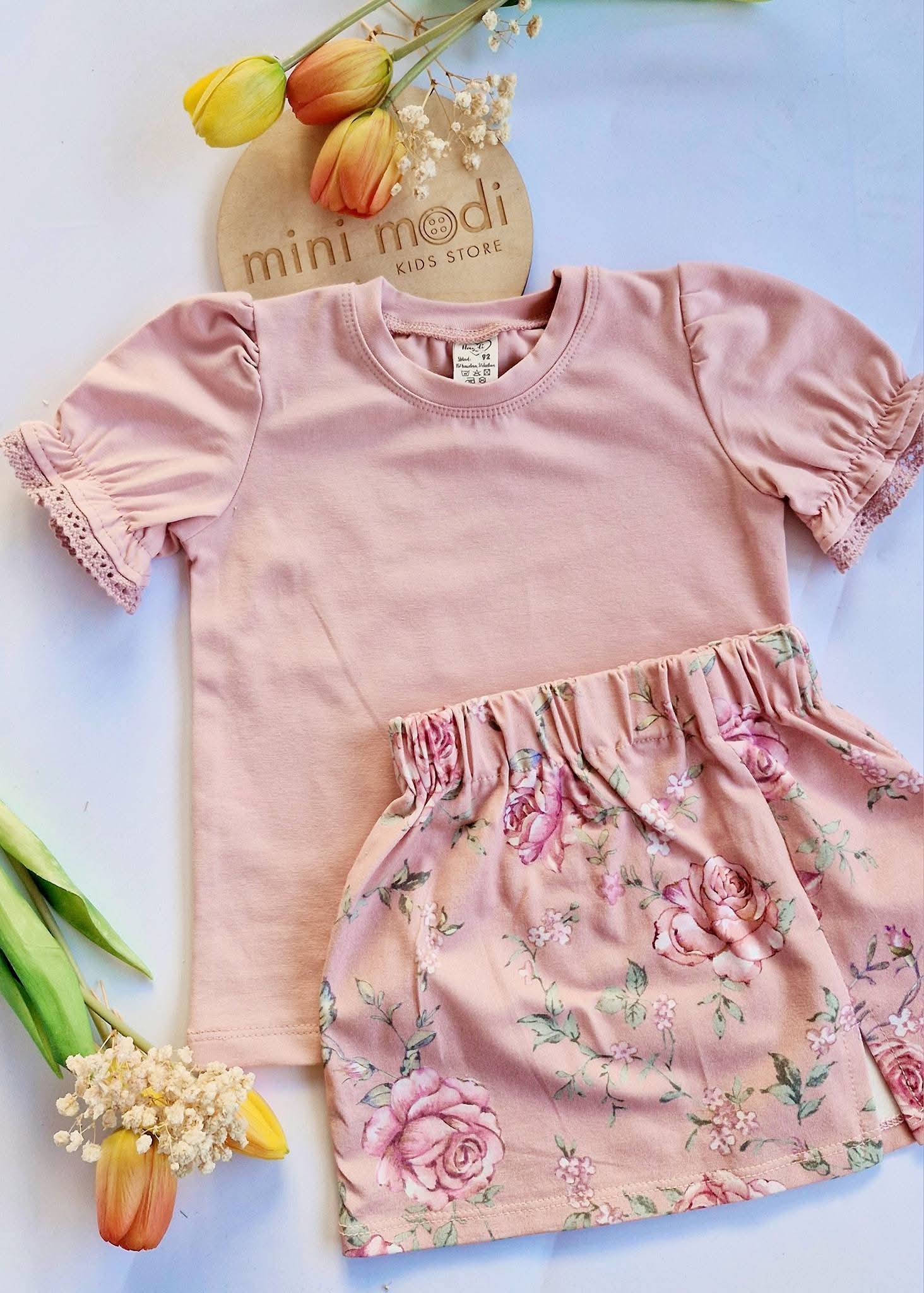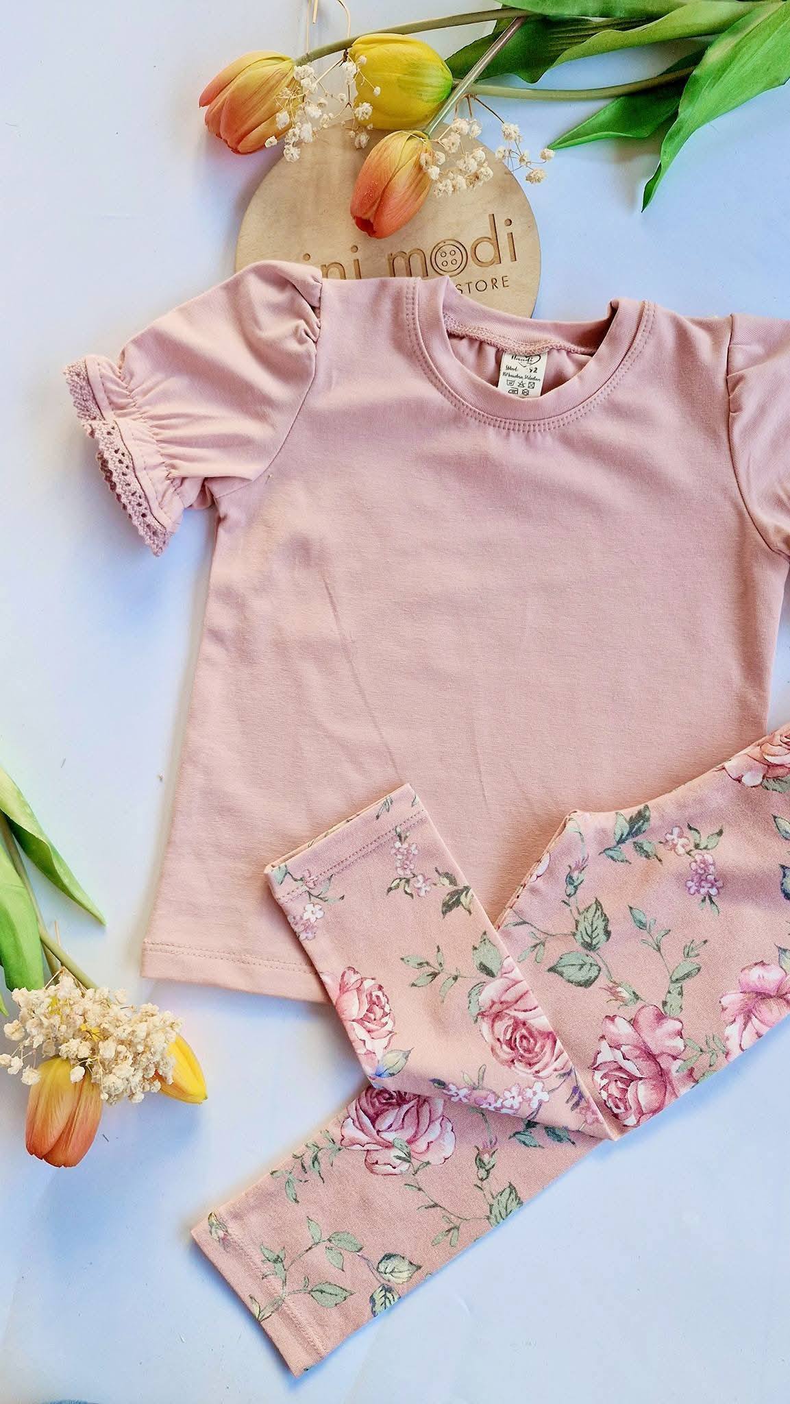 Bawełniane bluzeczki z krótkim rękawkiem i ozdobną koronką.  Kolor pudrowy róż . Dostępne w rozmiarach 86 – 134.