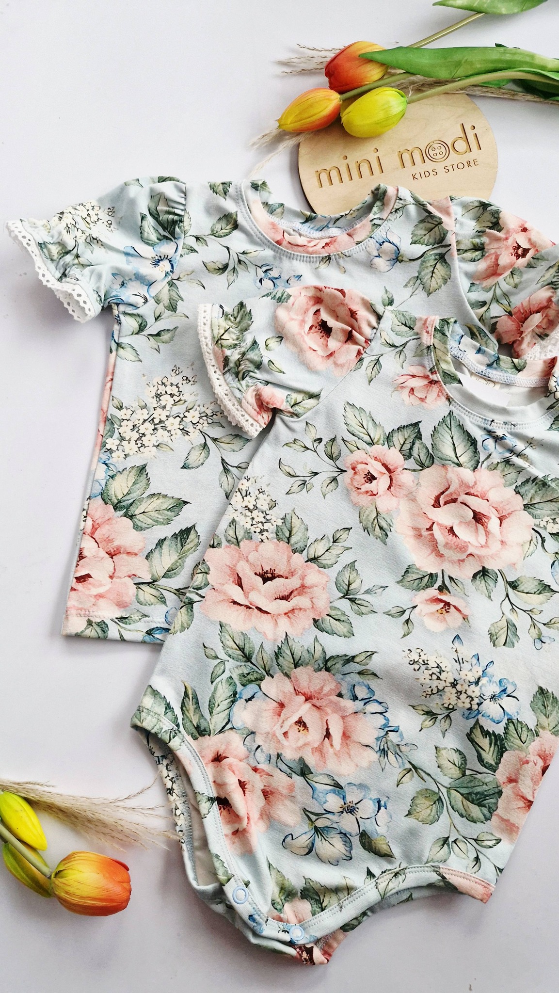 Bawełniane bluzeczki z krótkim rękawkiem w delikatny wzór morelowych kwiatów. Dostępne w rozmiarach 86 – 134.