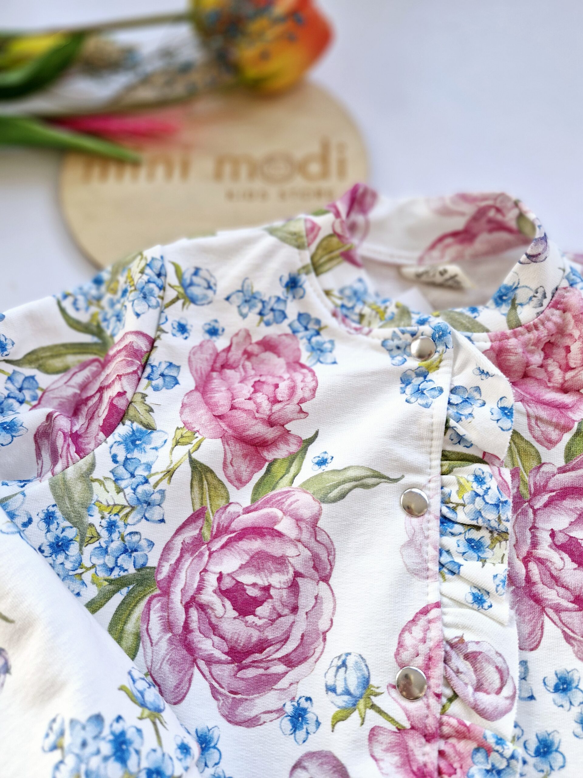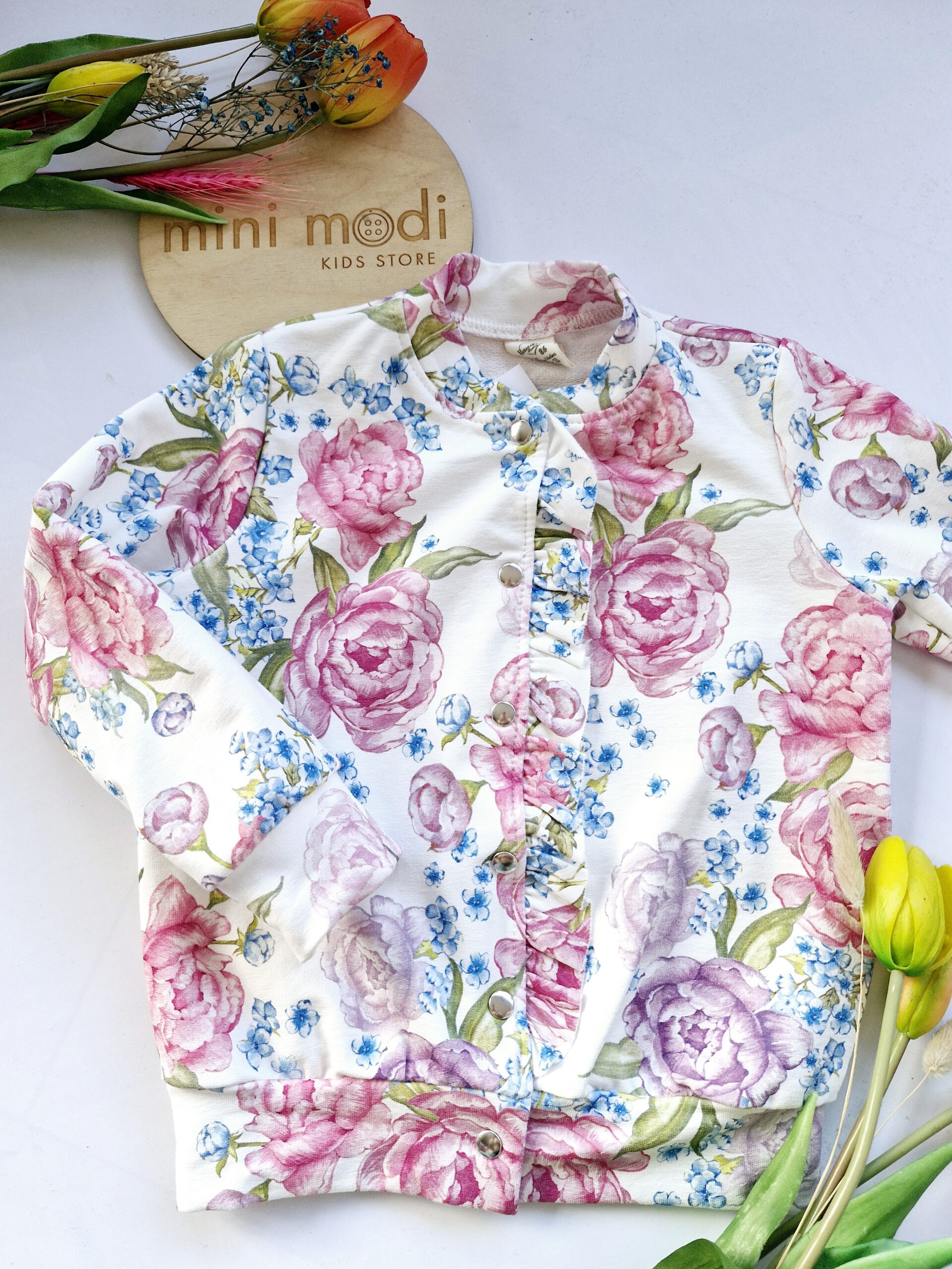 Bomberka, bluza zapinana na napy w śliczny, wiosenny wzór kwiaty na bieli.
