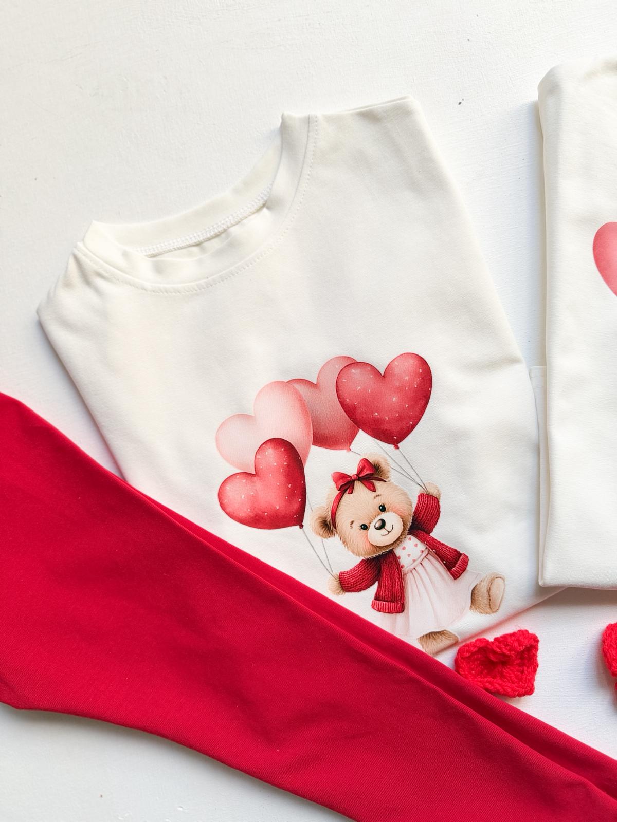 Świetne, bawełniane bluzeczki z krótkim rękawkiem dla dziewczynki. Bluzka w kolorze ecru z misiem i czerwonymi balonikami polskiego producenta Mam Ten Luz.