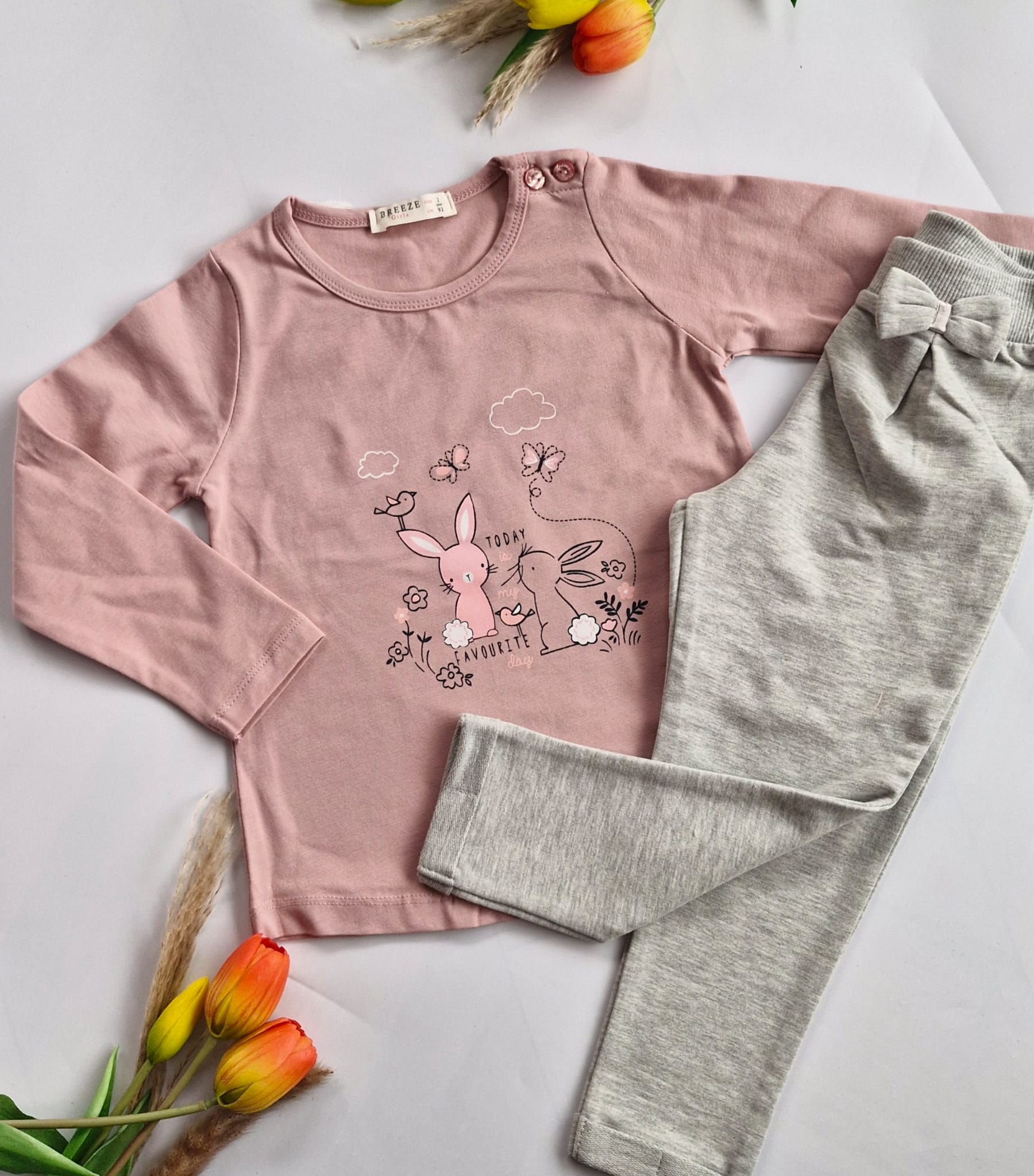 • różowa bluzka zapinana na dwa logowane guziczki  z aplikacją króliczków