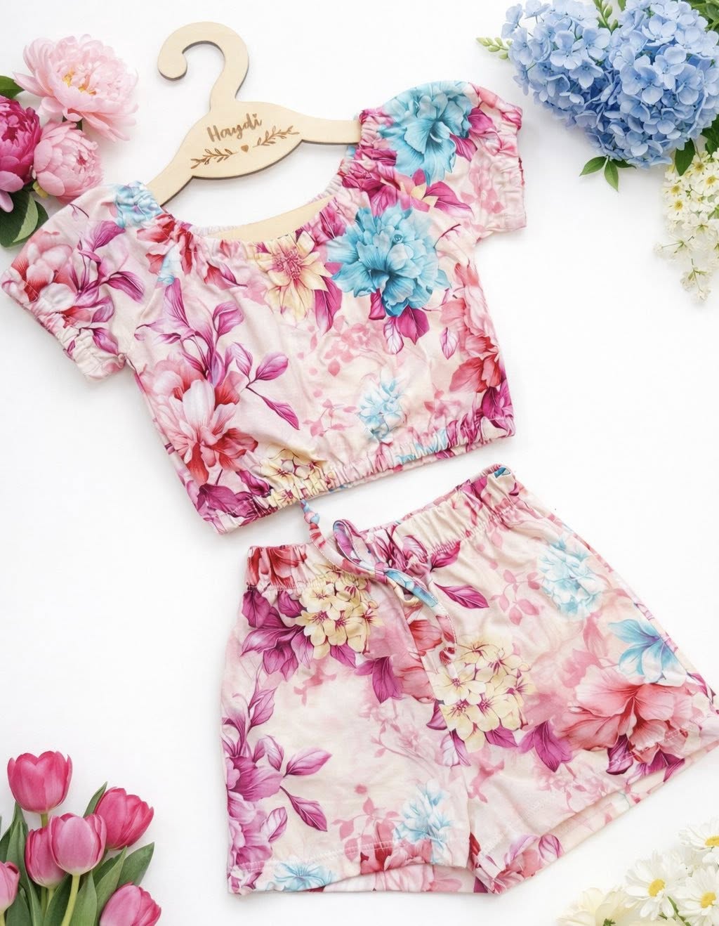 Bawełniany komplet na lato w piękny wzór kolorowych kwiatów na pudrowym tle. Dostępne w rozmiarach 92 – 134.