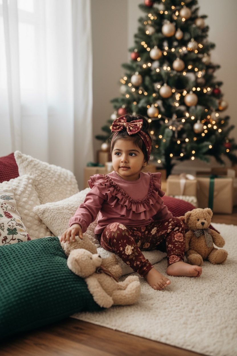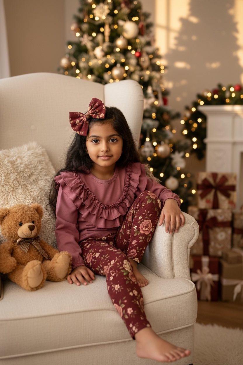 Śliczne legginsy dla dziewczynki w delikatne kwiaty na bordowym tle. Idealnie sprawdzi się na sesje świąteczne i wyjątkowe okazje.