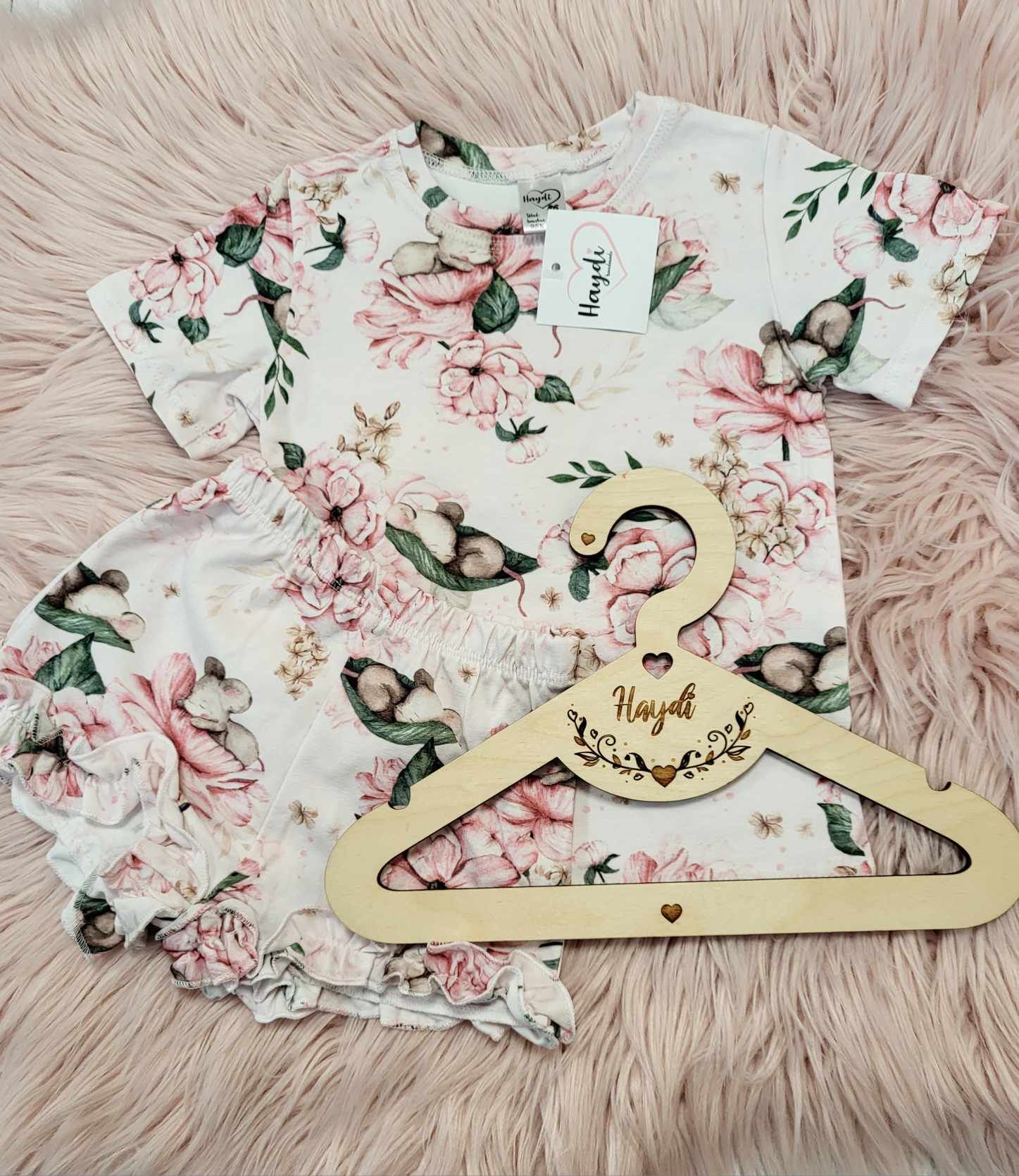 Śliczny wzór w delikatne kwiaty i myszki. Piżamka na lato.