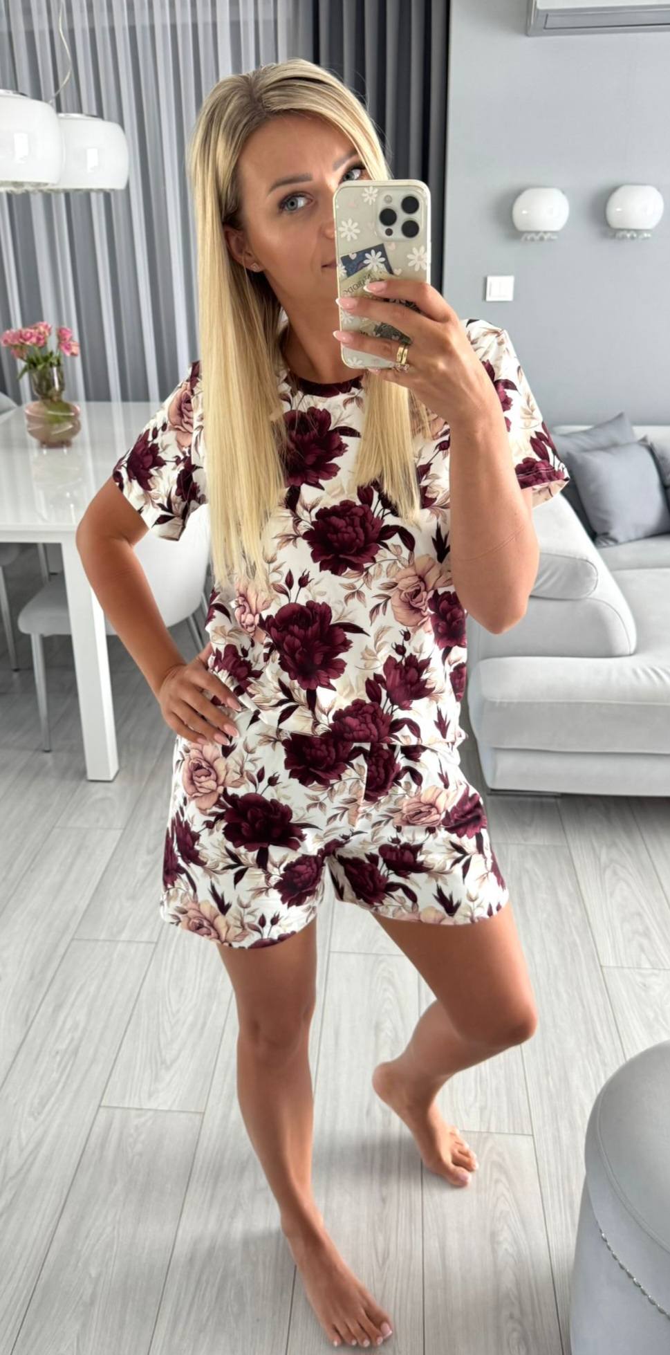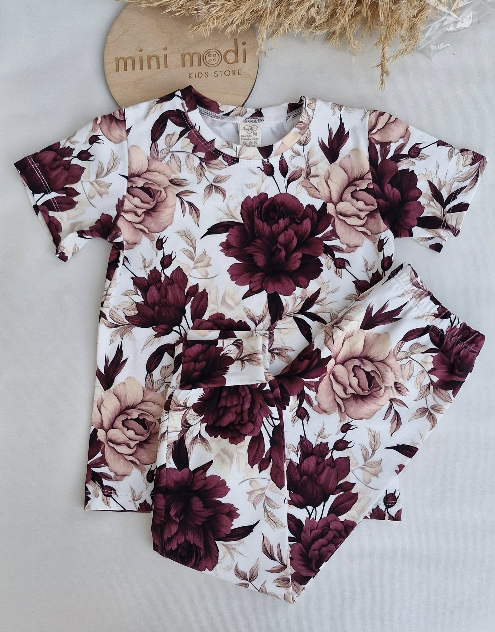 Bawełniana piżamka dla mamy i córki. Piękny, jesienny wzór w bordowo – beżowe kwiaty.