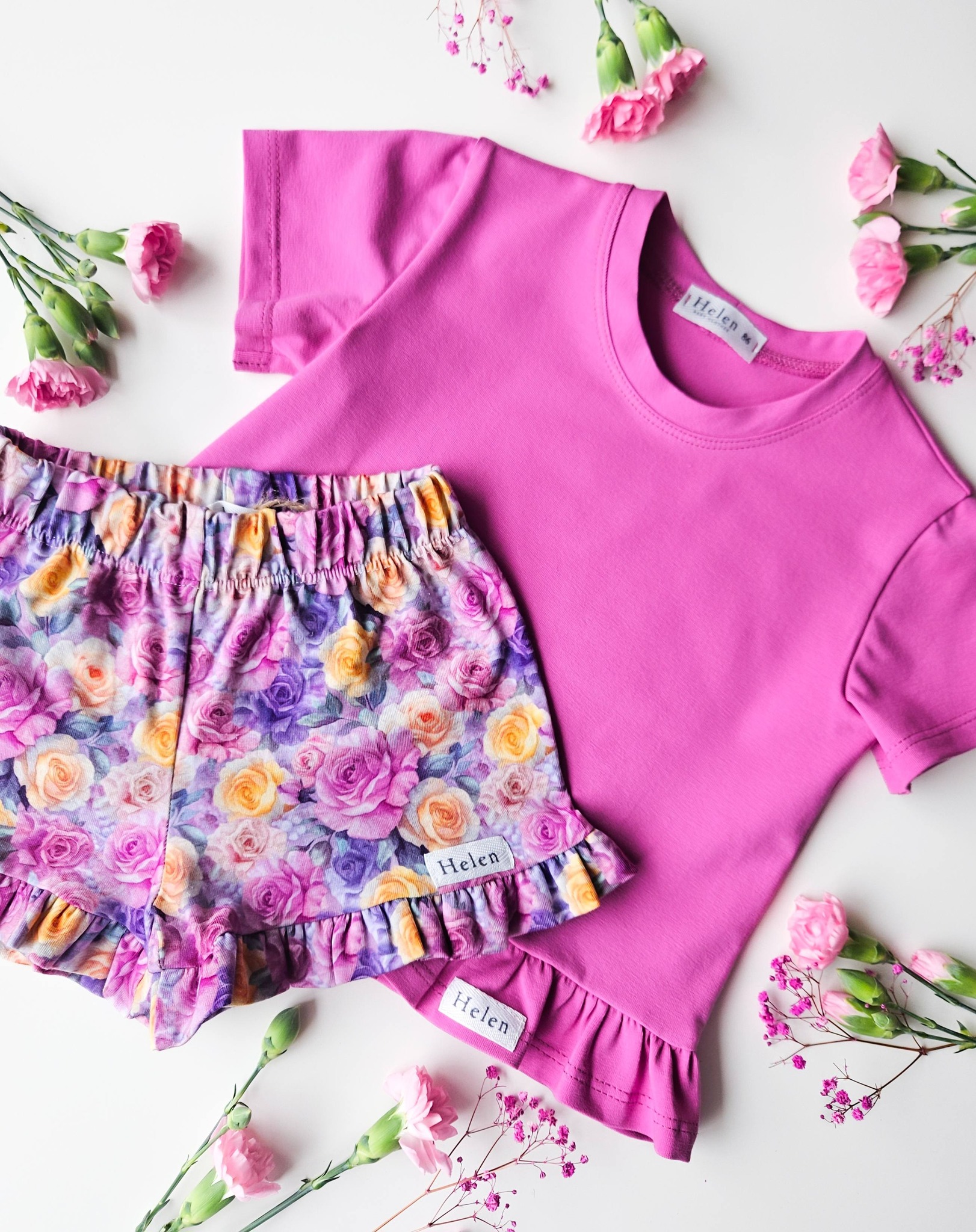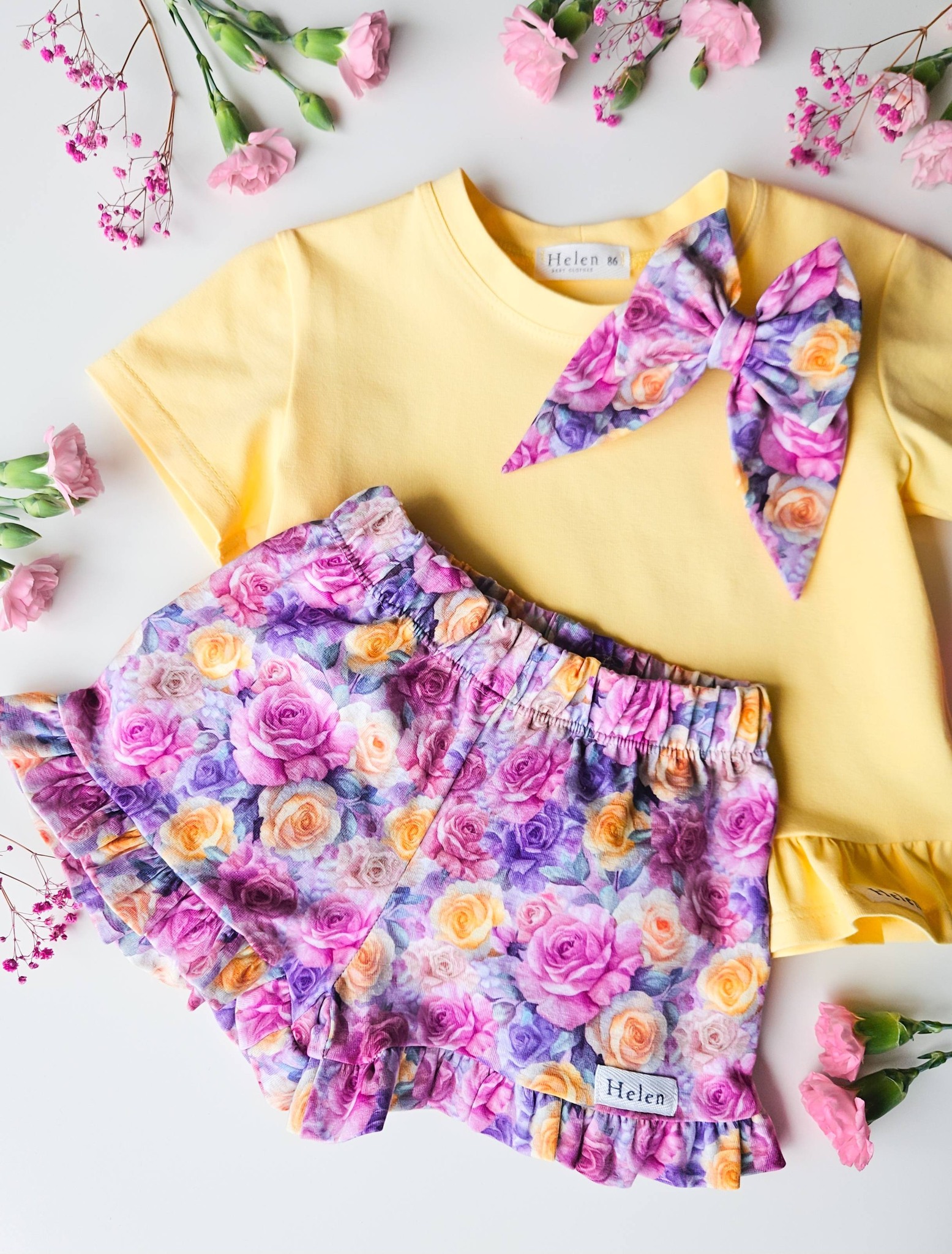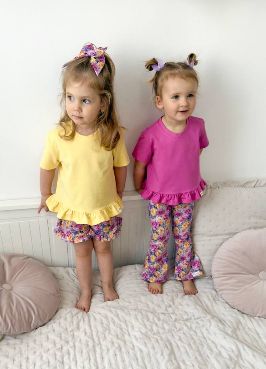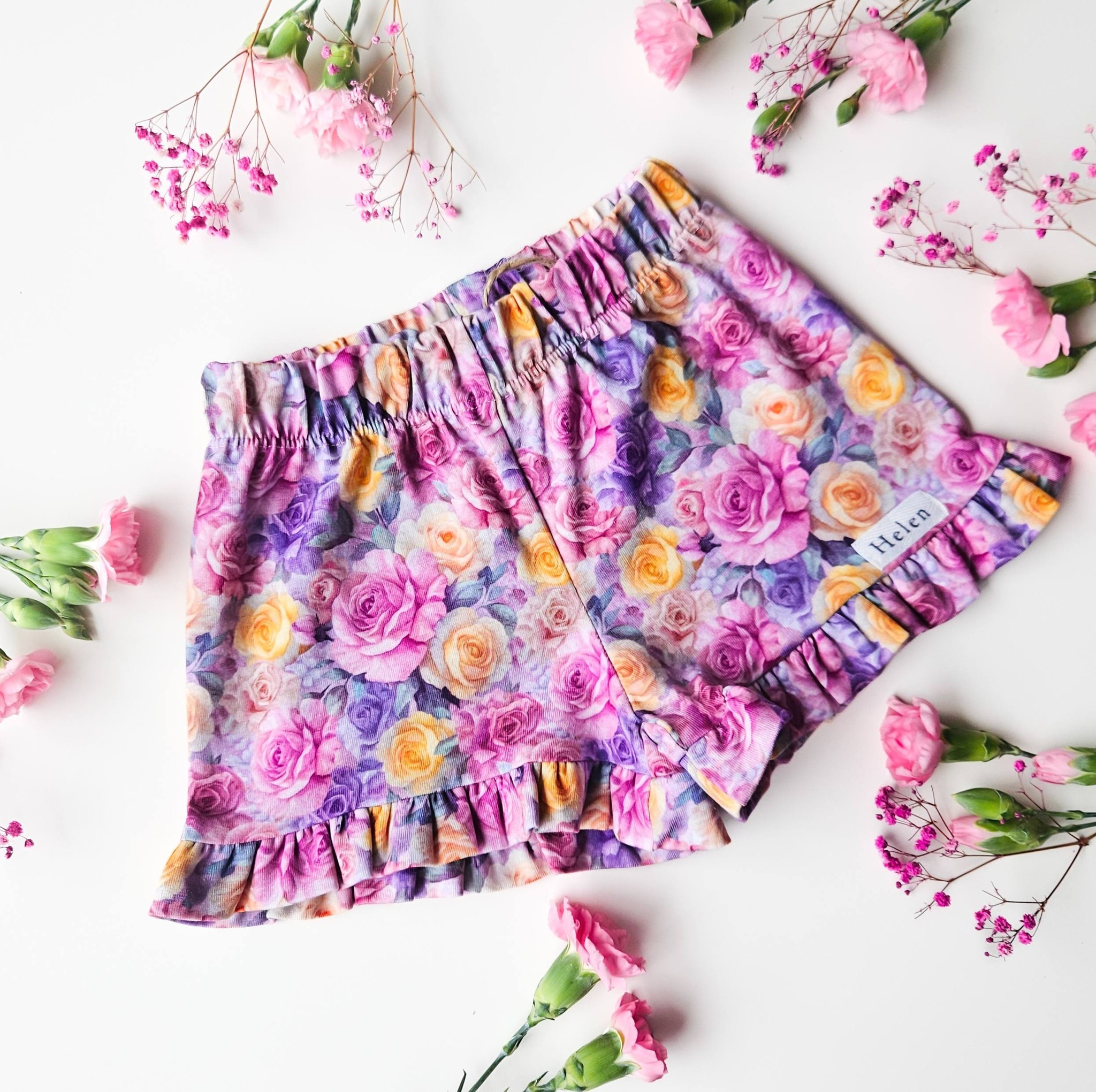 Spodenki dla dziewczynki z falbanką w kolorowe różyczki.