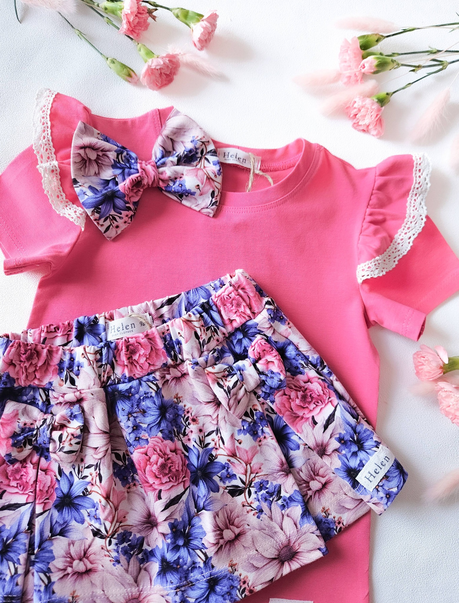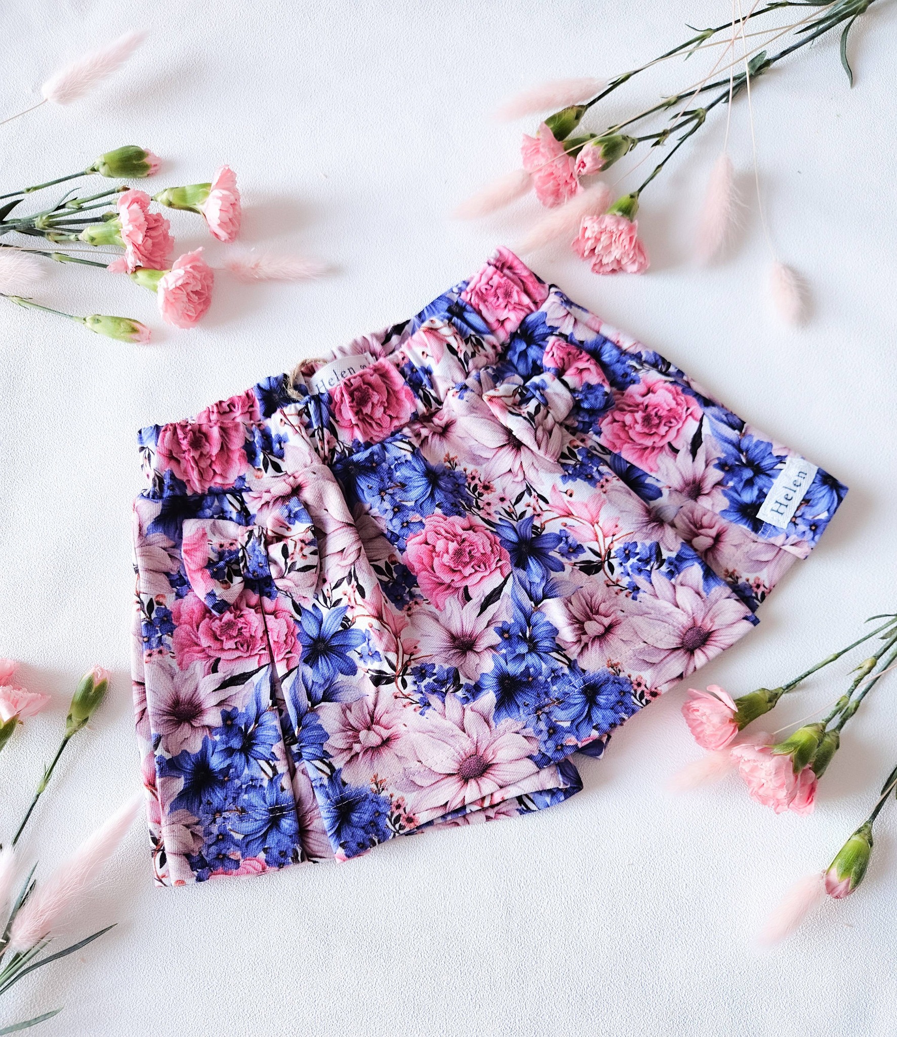 Spódnico-spodenki z zakładkami i kokardkami.