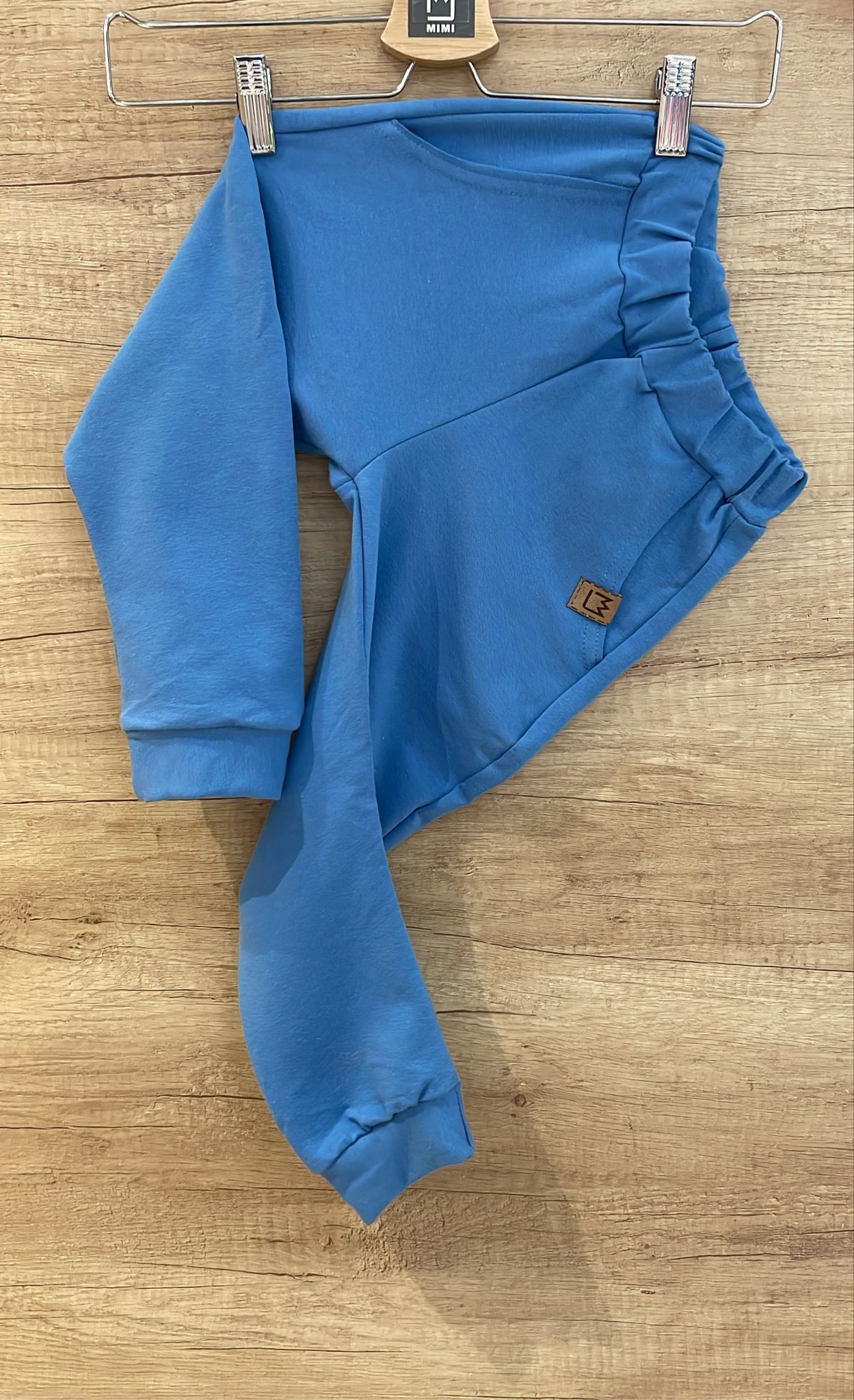 Klasyczny model spodni na gumce polskiej firmy Mimi – idealne na szczupłego chłopaka. Kolor niebieski. Spodnie wykonane są z cienkiej, miękkiej i przewiewnej bawełny. Posiadają dwie kieszonki z przodu i dwie z tyłu. Na dole nogawki znajdują się ściągacze.