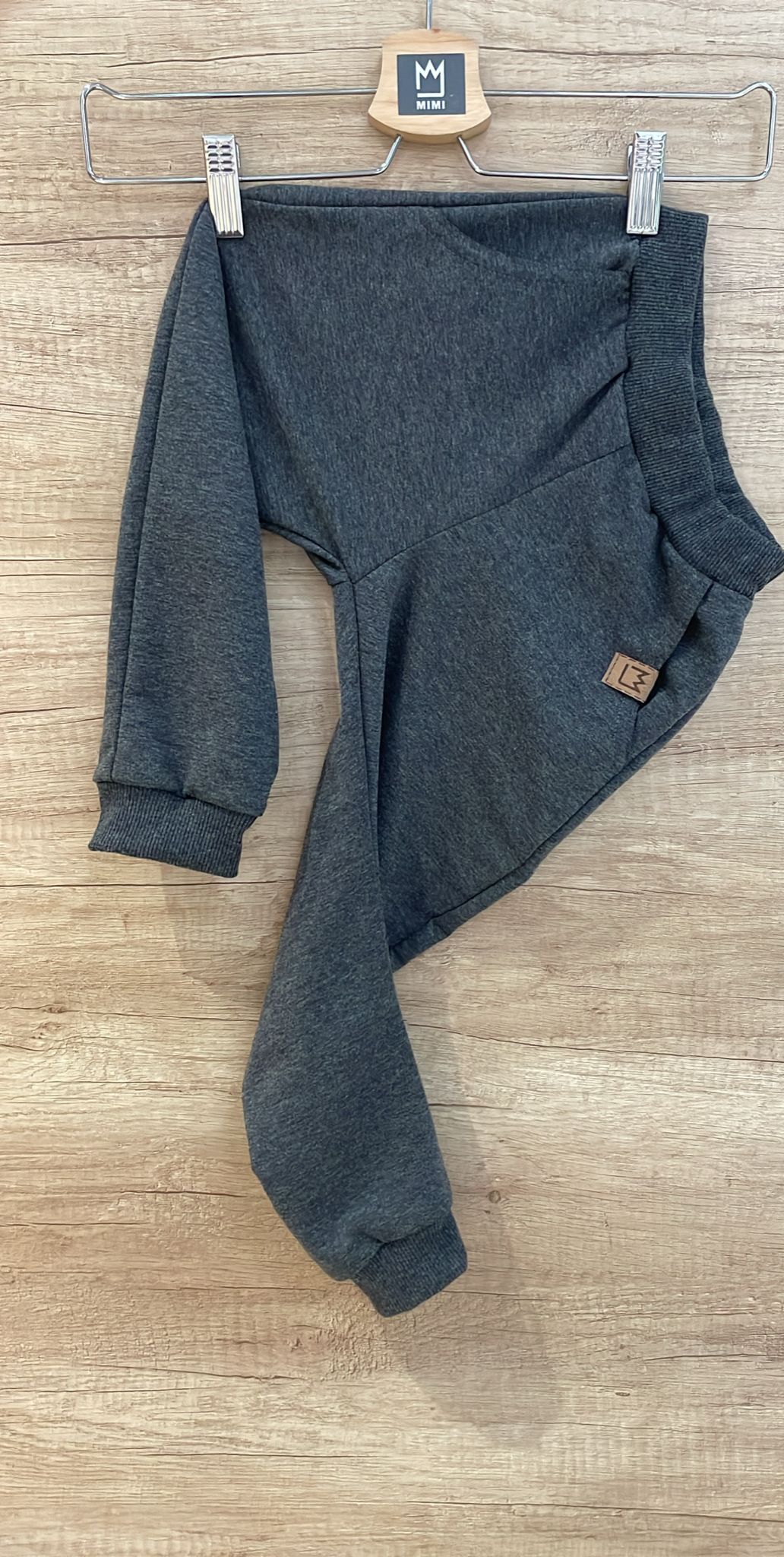 Klasyczny model spodni na gumce polskiej firmy Mimi – idealne na szczupłego chłopaka. Kolor szary melanż. Spodnie wykonane są z cienkiej, miękkiej i przewiewnej bawełny. Posiadają dwie kieszonki z przodu i dwie z tyłu. Na dole nogawki znajdują się ściągacze.