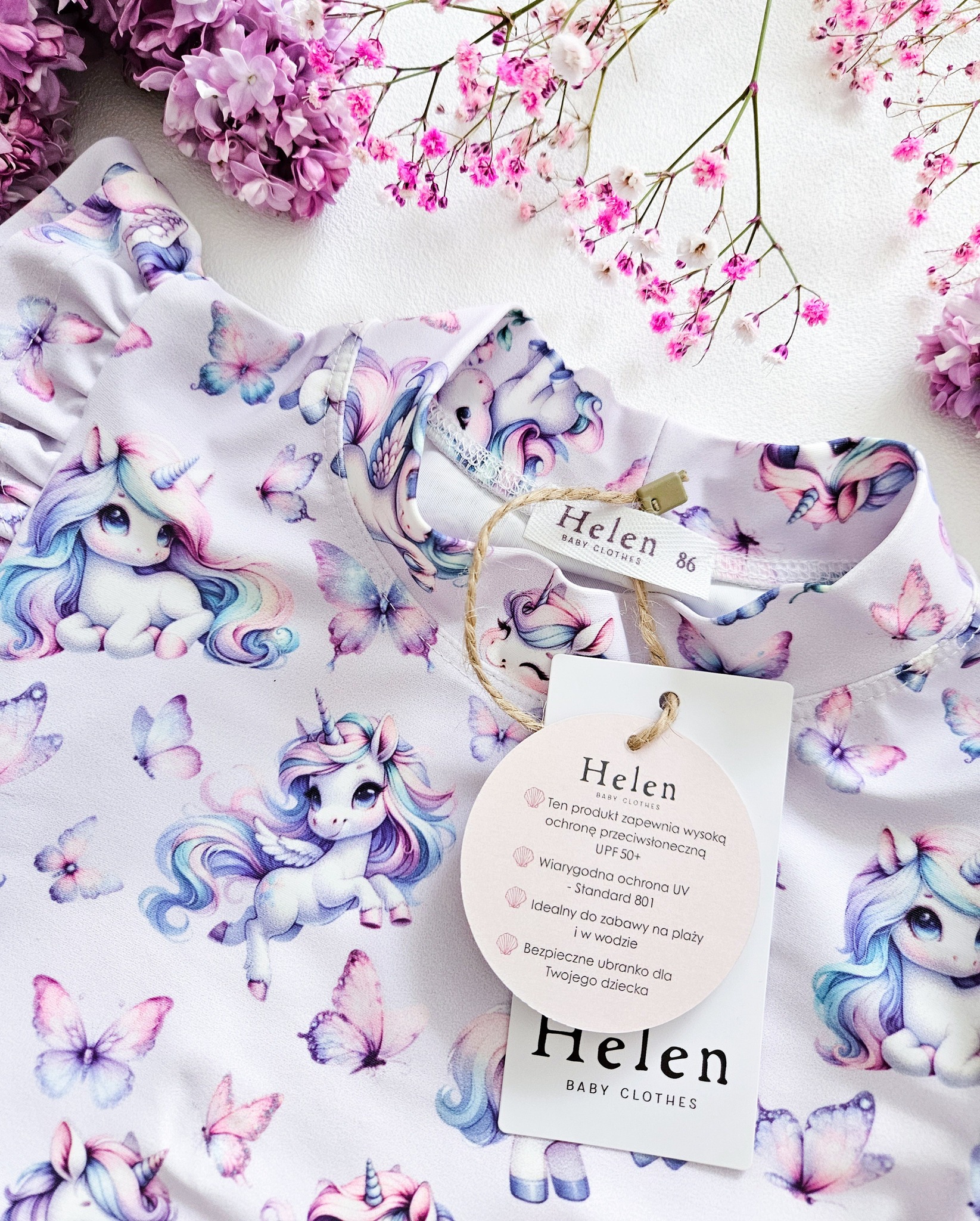 Strój kąpielowy dziewczęcy z ochroną przeciwsłoneczną UPF 50+. Wzór jedorożce.