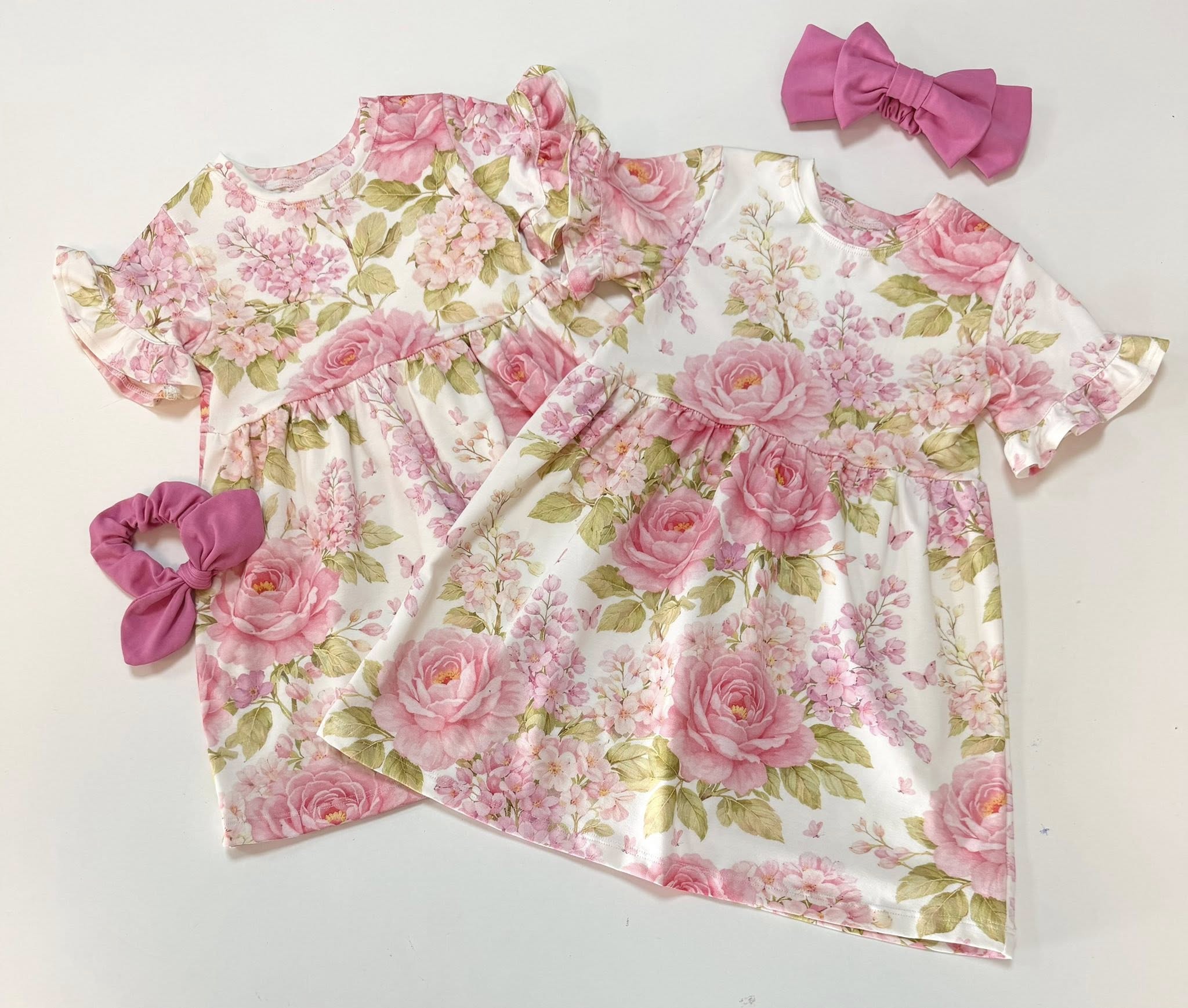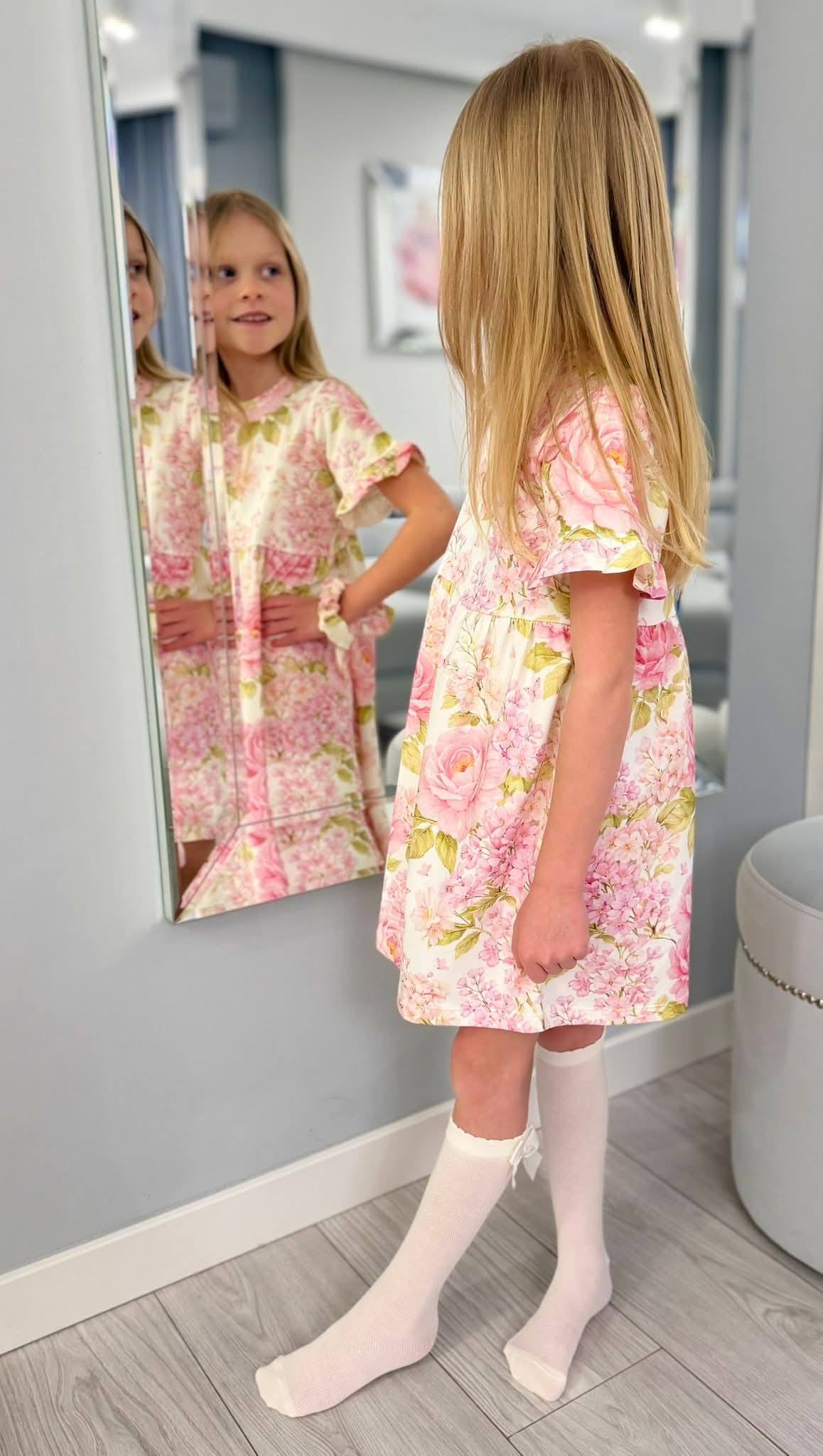 Śliczna sukienka dla dziewczynki w piękny wzór malowanych kwiatów na pudrowym tle.