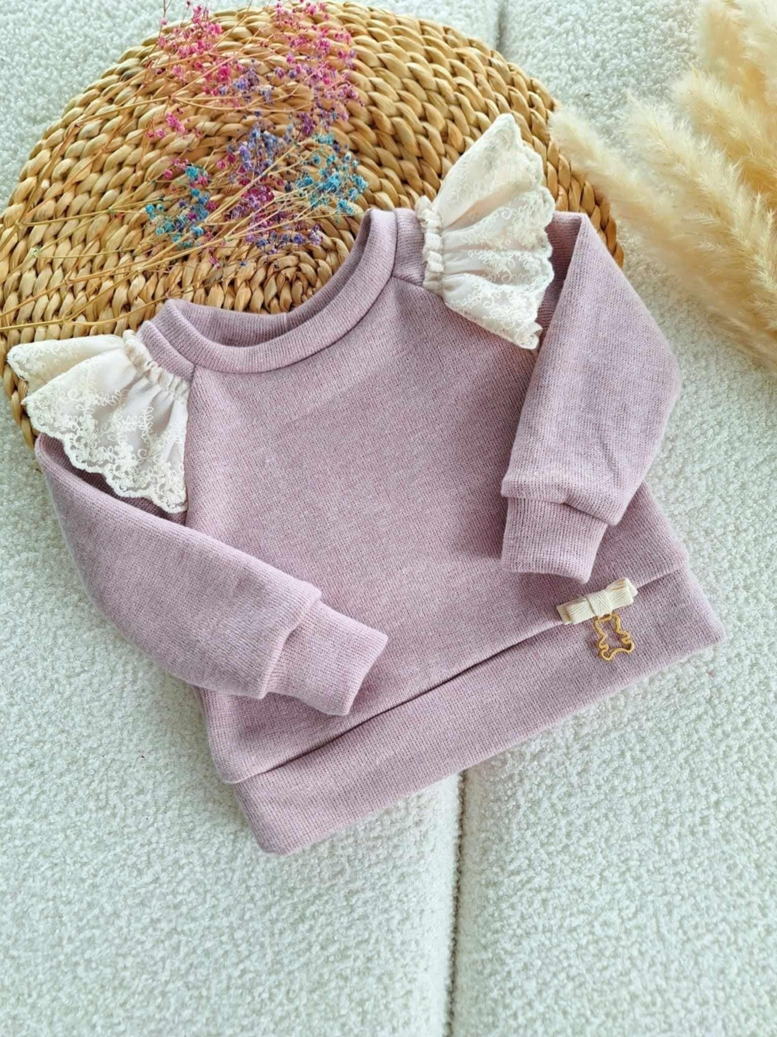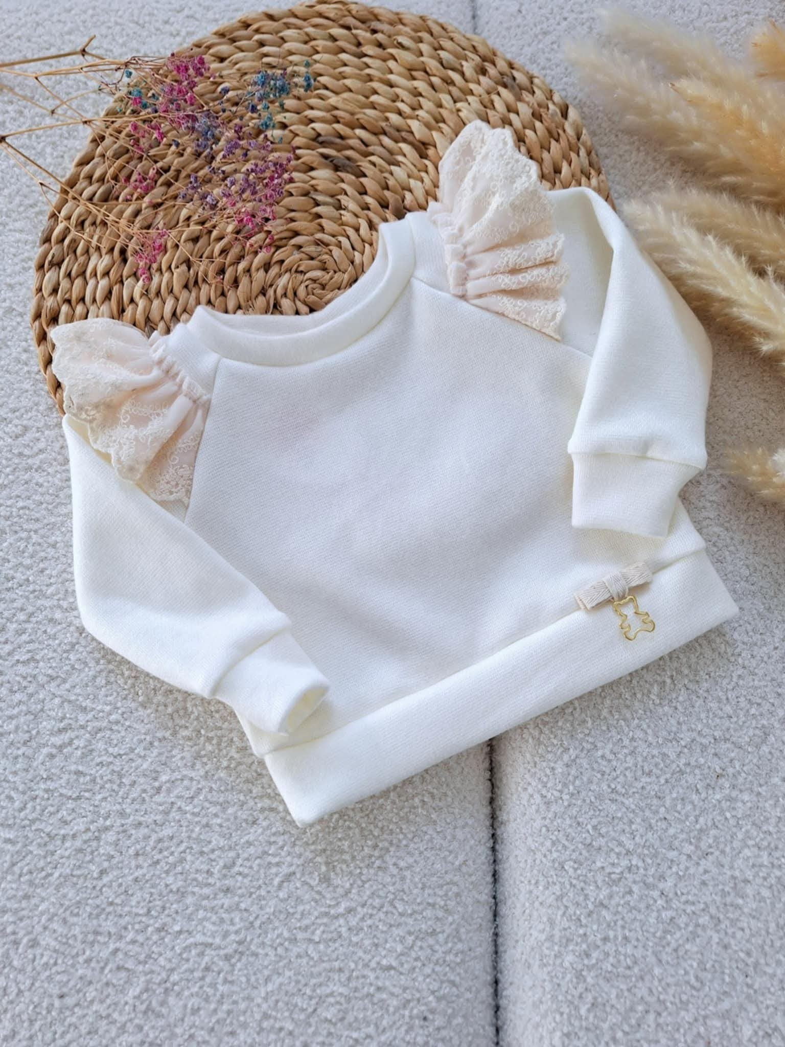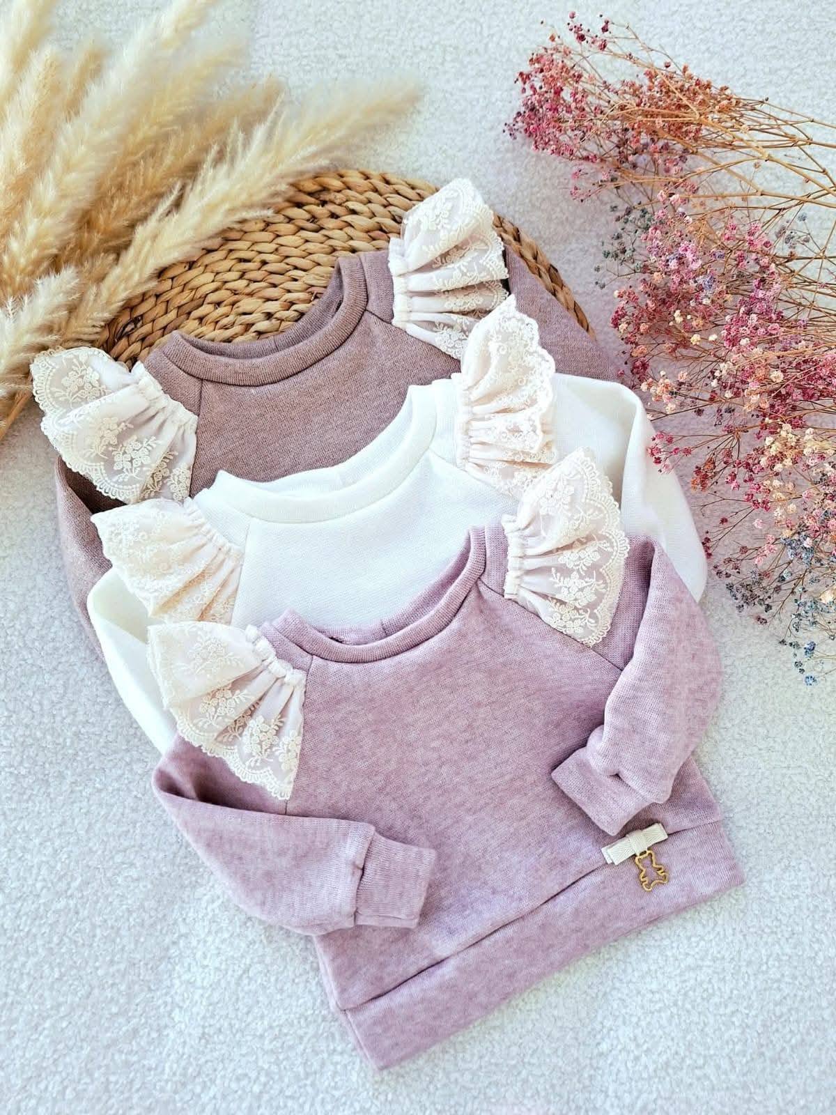 Sweterek z haftowaną koronką oraz ozdobną kokardką z 🧸. Dostępny w 3 kolorach: