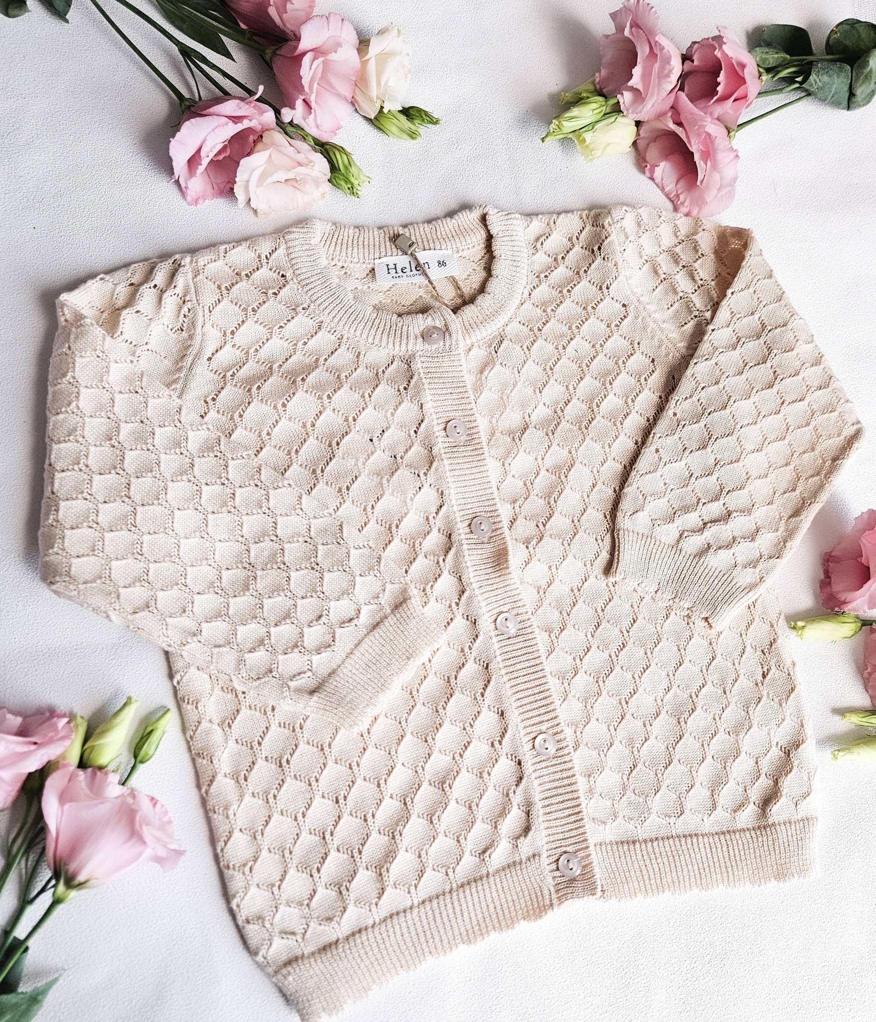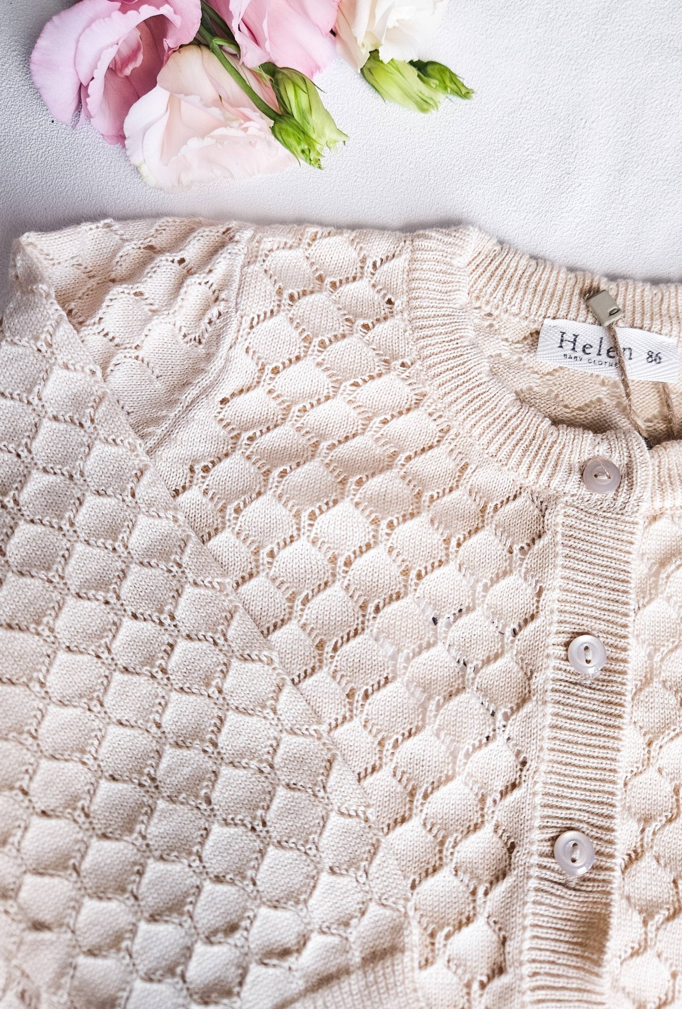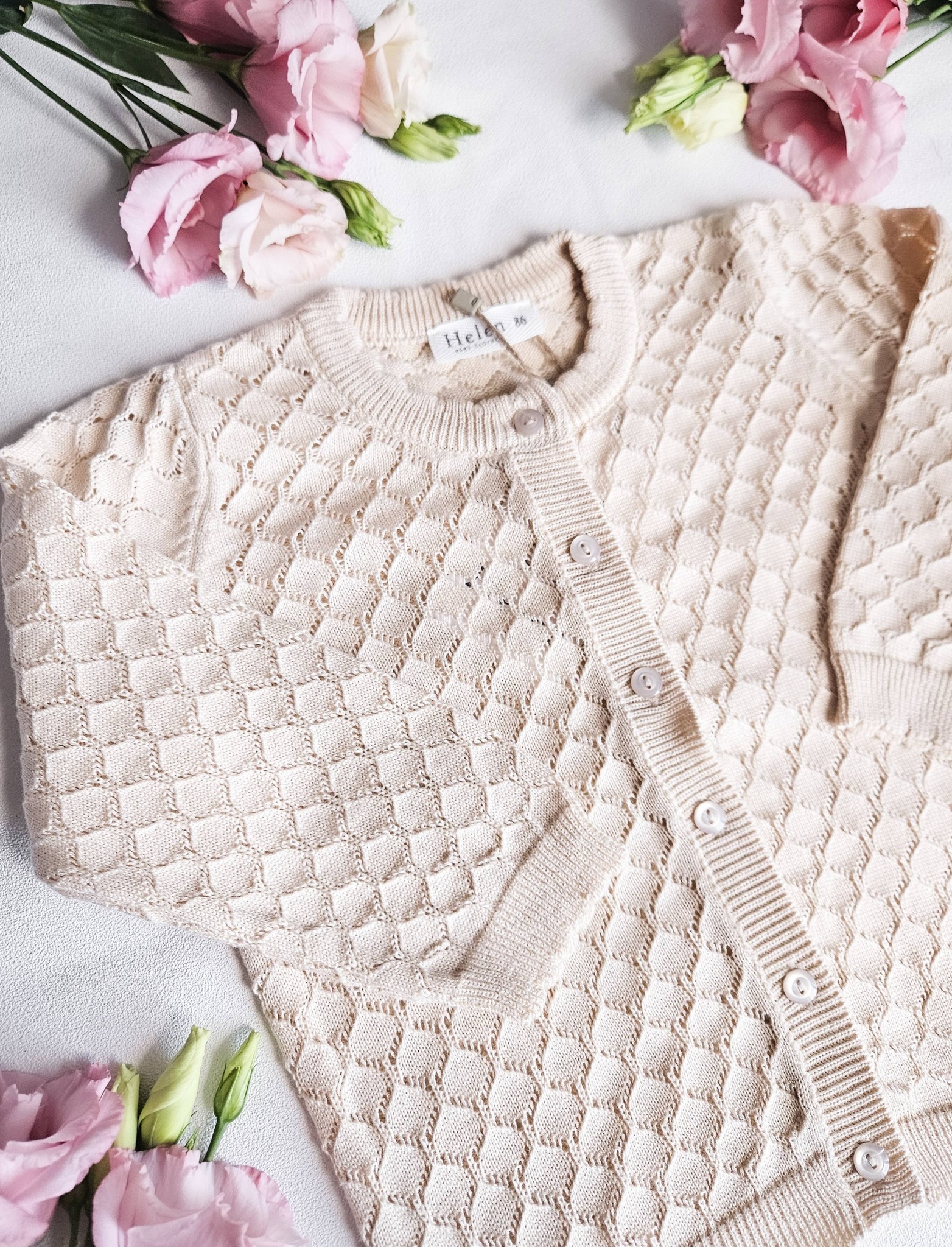 Ażurowe sweterki w kolorze beżowym. Zapinany na guziczki.
