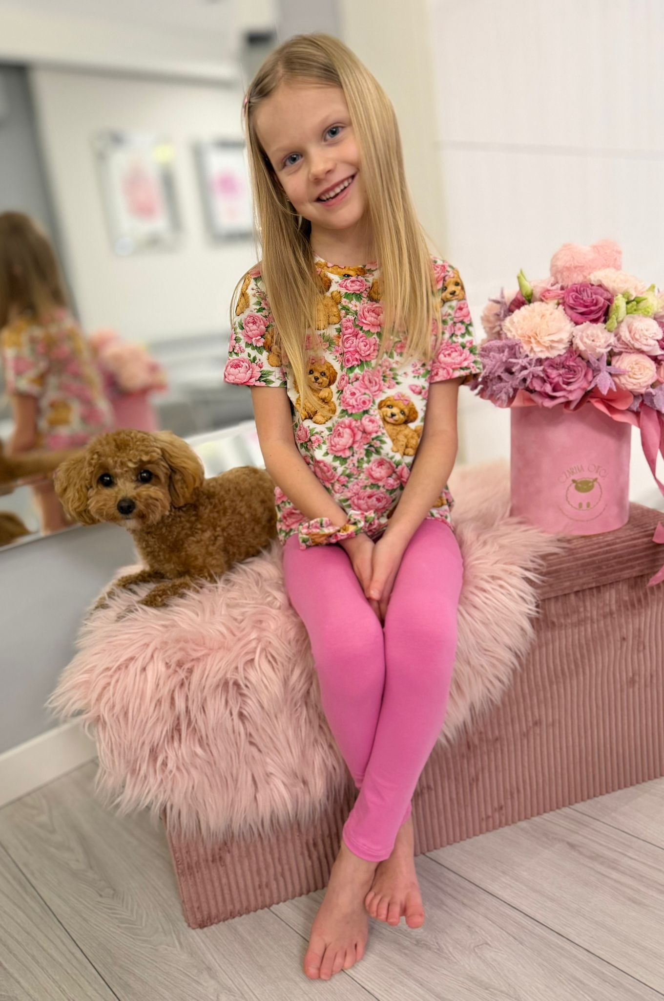 Bawełniane bluzeczki z krótkim rękawkiem. Śliczna bluzka w kwiaty i pieski. Dostępne w rozmiarach 92 – 134.