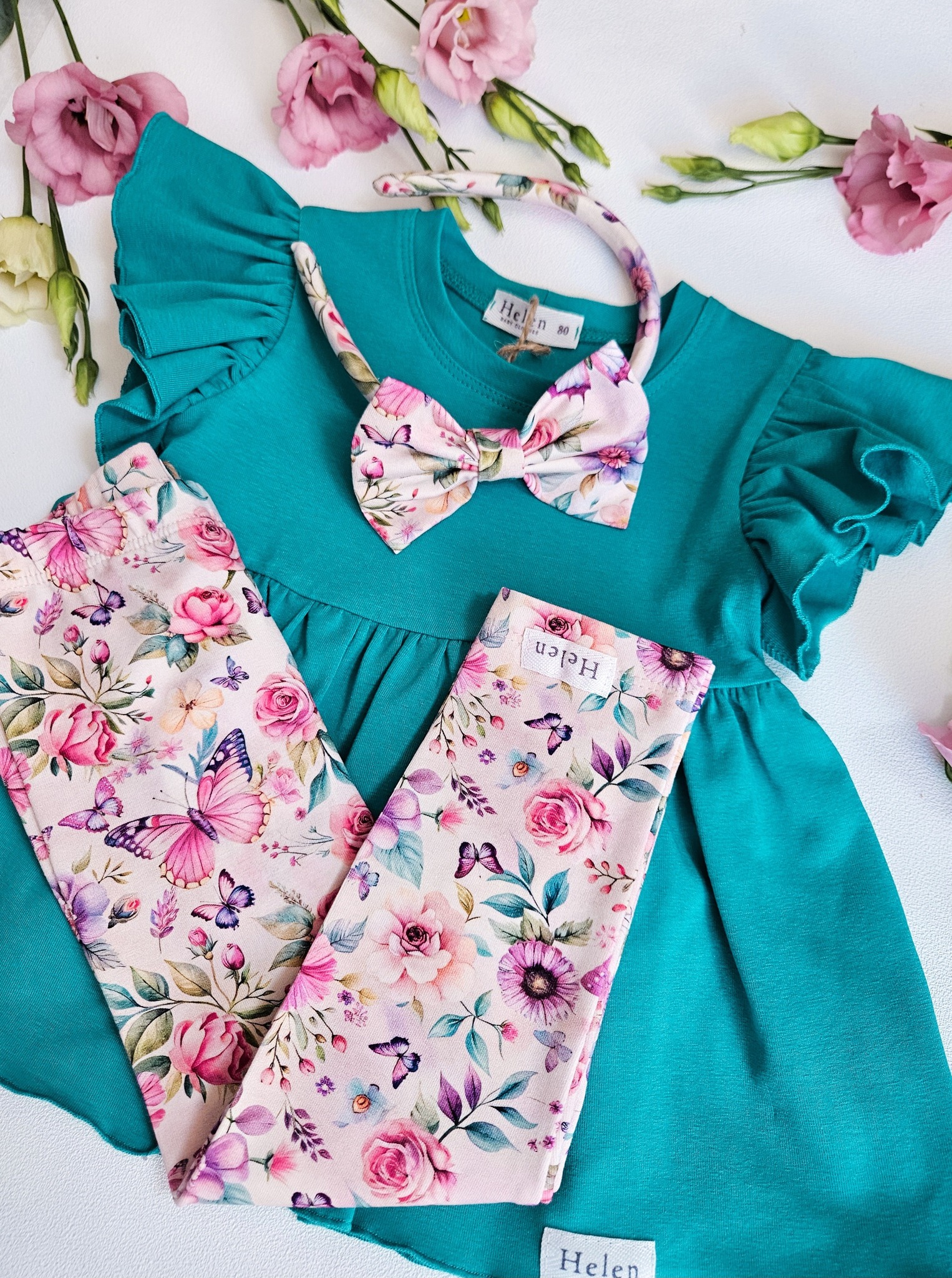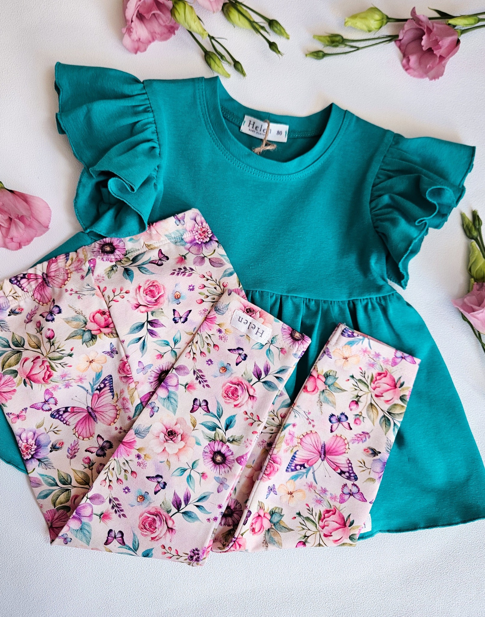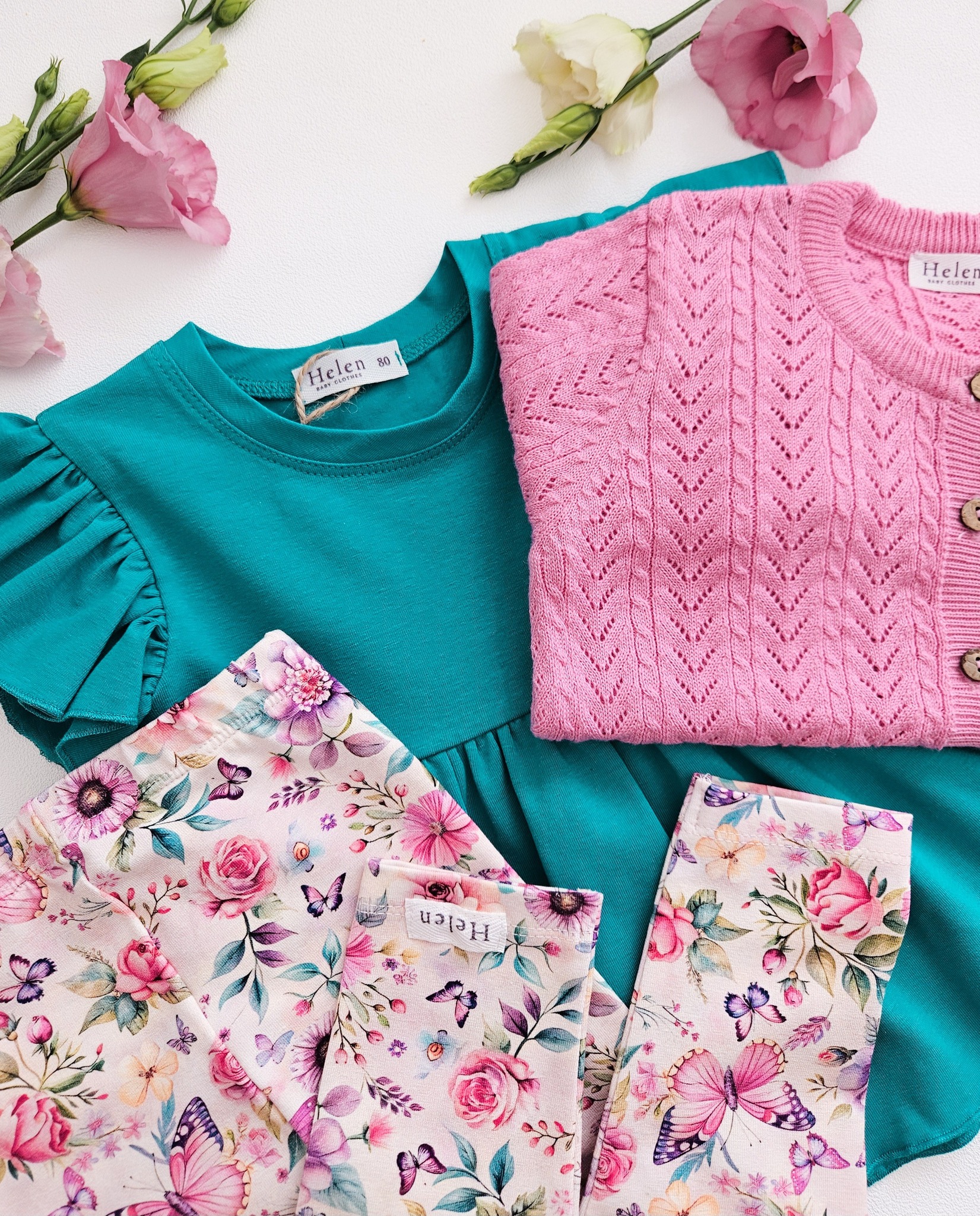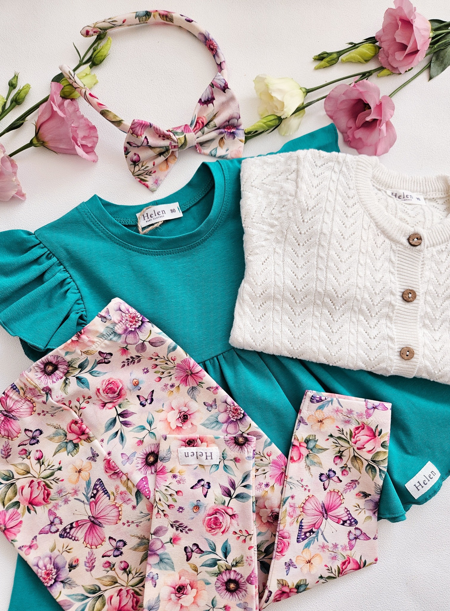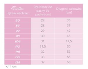 Tunika wykonana jest z miękkiej bawełny. Rękawki zakończone są delikatnym ściągaczem oraz falbanką z koronką, Na dole tuniczki również falbanki.